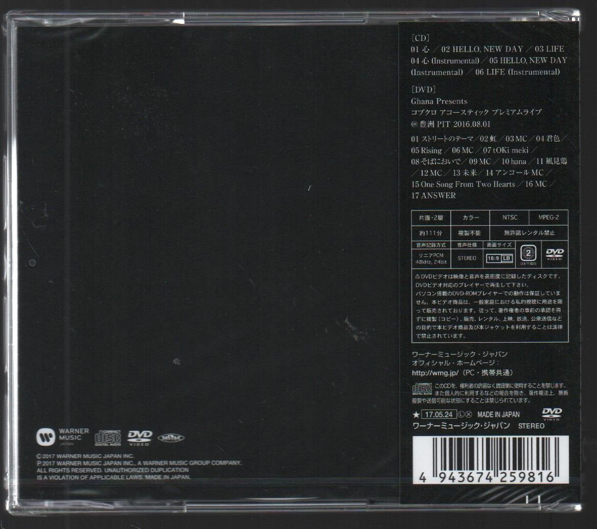 2017年5月27日公開、映画『ちょっと今から仕事やめてくる』主題歌 ■日本国内正規盤 ■初回限定盤 ■DVD付き ■品番:WPZL-31296 ■ワーナーより発売 ■税込価格¥3,024 ■2017/5/24発売 CD 1. 心 2. HELLO, NEW DAY 3. LIFE 4. 心(Instrumental) 5. HELLO, NEW DAY(Instrumental) 6. LIFE(Instrumental) DVD 1. ストリートのテーマ 2. 虹 3. MC 4. 君色 5. Rising 6. MC 7. tOKi meki 8. そばにおいで 9. MC 10. hana 11. 風見鶏 12. MC 13. 未来 14. アンコール MC 15. One Song From Two Hearts 16. MC 17. ANSWER