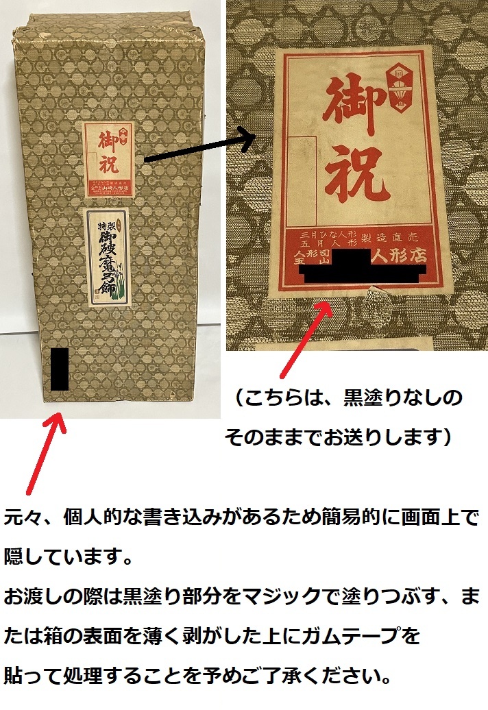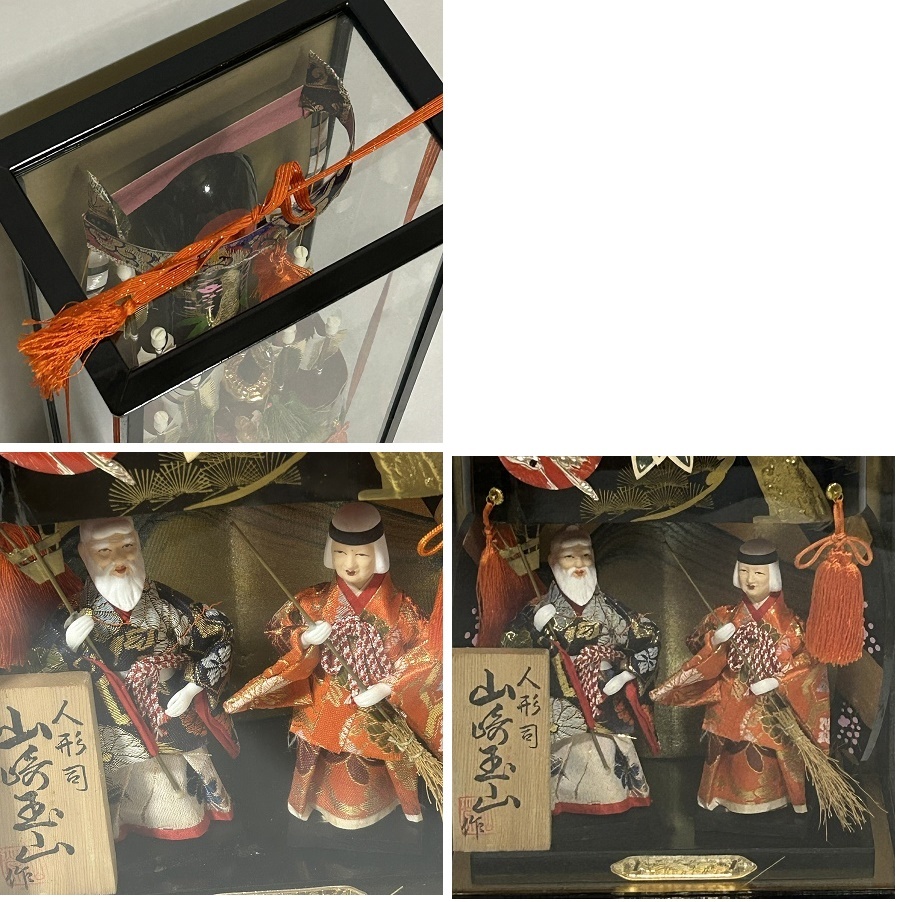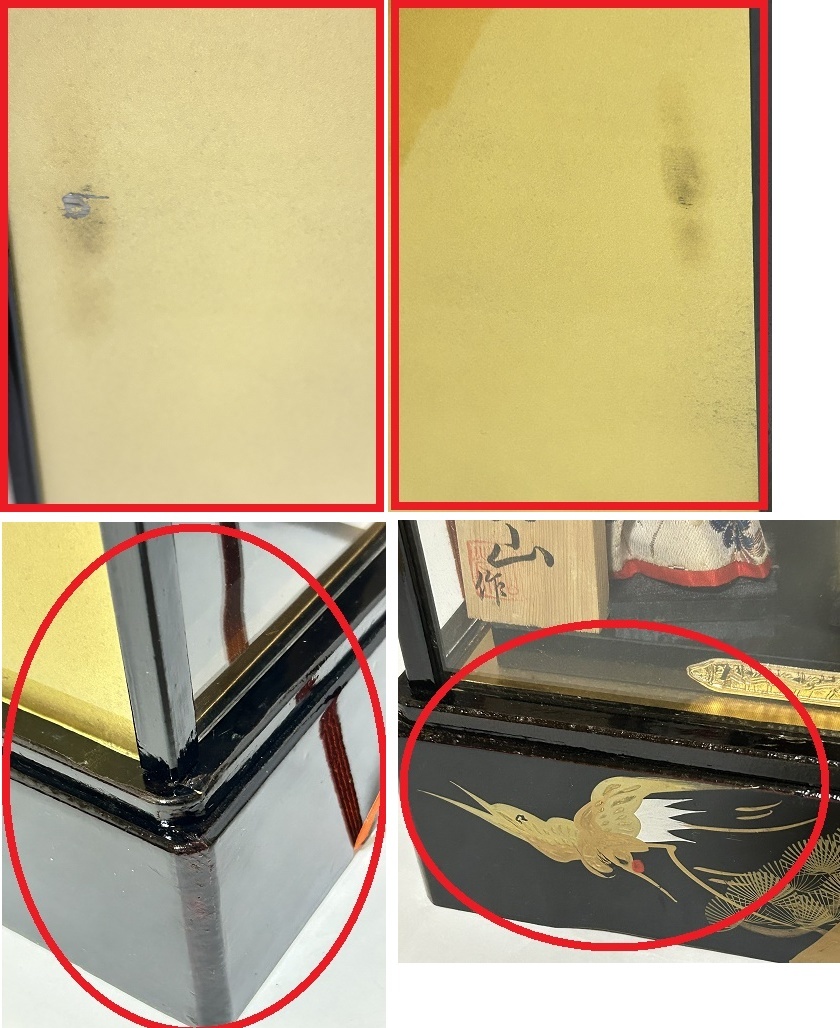 | 昭和レトロ 特製 御破魔弓飾り 人形司 山崎玉山作 日本人形 鶴 つる 松 矢 剣 支柱が四方に4本、後板、ガラスが両側、前面で3枚、天板は黒枠2枚あり、間にガラスを挟みます。 固定されている物ではなく、支柱の溝に沿ってガラスをはめ込み、天板を乗せ、紐で周りを縛る商品です。 そのため、ぐらつきあり。 持ち運ぶ際は、必ず下の黒い台座部分を抱え持つようにしてください。 支柱やガラス部分、紐などの上部だけを持つと抜け落ちる可能性があり、とても危険です。 サイズ: 本体:約24x16x64cm 約2.7kg 外箱:約27.3x18x67cm 本体+外箱含む約3.2kg ※これに+梱包の箱の重さがかかります 状態 ・本体:スレ傷、押し跡、折跡、切れ、汚れ、日焼け、房の乱れなど全体的に傷みあり。 ・外箱:スレ傷、押し跡、折跡、切れ、汚れ、日焼け、しわなど全体的に傷みあり。 箱は特にかなり状態が悪いです。 ※ジャンク品としてご理解いただける方のみご購入ください。 厄除け 魔除け 初正月 端午の節句 管理番号:破魔弓③ーc 【雛人形・羽子板・五月人形 共通注意事項】 商品自体が昭和時代(1970年代)の物であり、物により経年劣化による痛みが激しい物もあります。 脆い部品のため、配送中の振動などにより破損する確率がある事も含め、ジャンク品として出品致します。 [商品によって外箱(商品の入っていた箱)に黒塗り部分がある物について] 元々、個人的な書き込みがあるため簡易的に画面上で隠しています。 お渡しの際は黒塗り部分をマジックで塗りつぶす、または箱の表面を薄く剥がした上にガムテープを 貼って処理することを予めご了承ください。 | |||