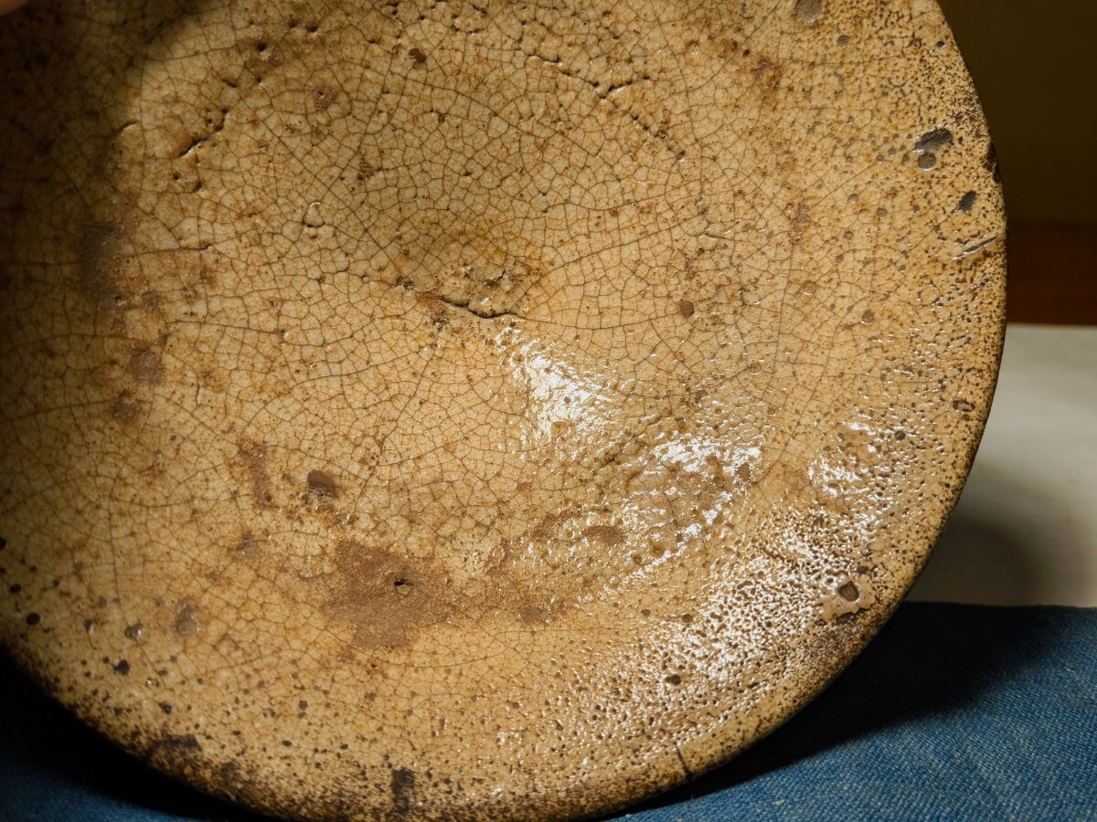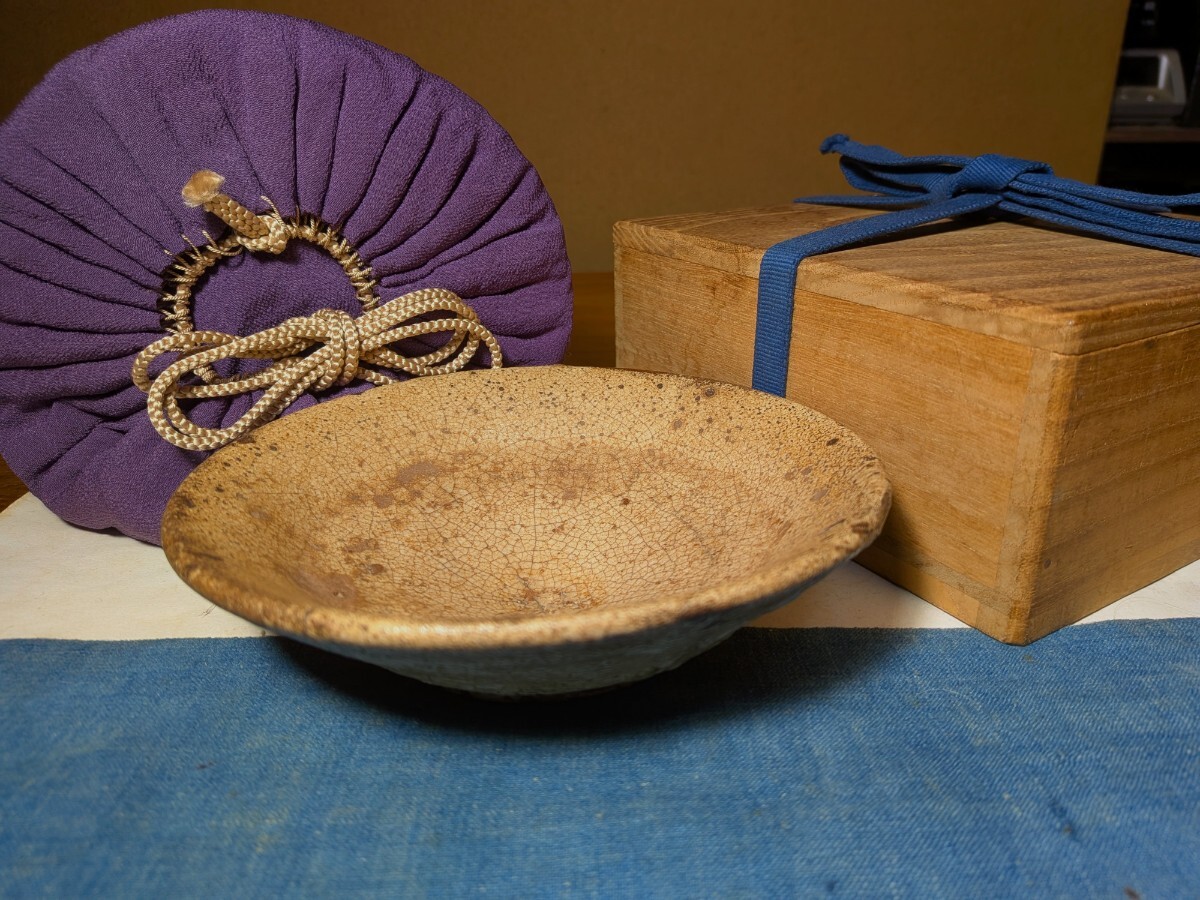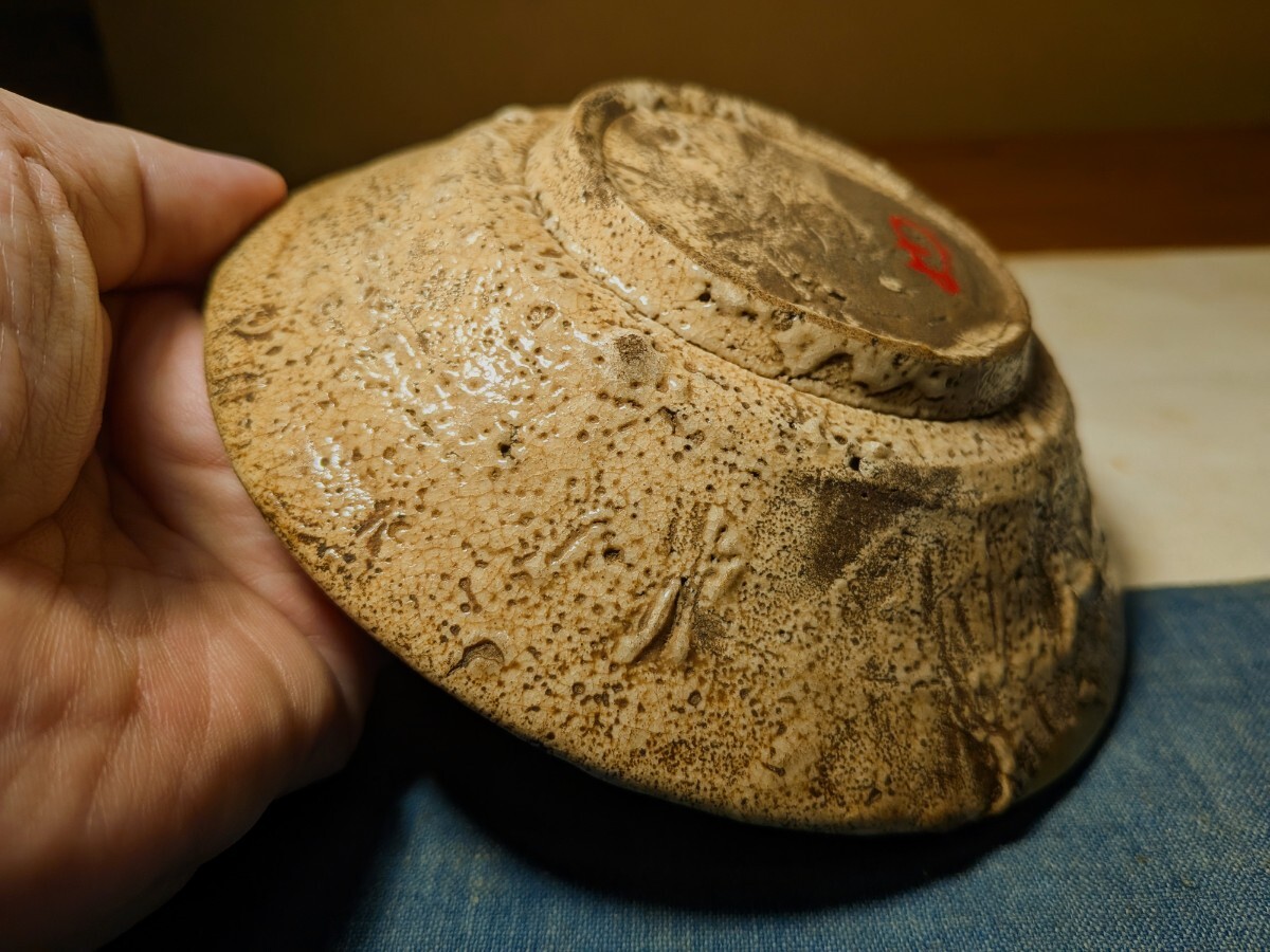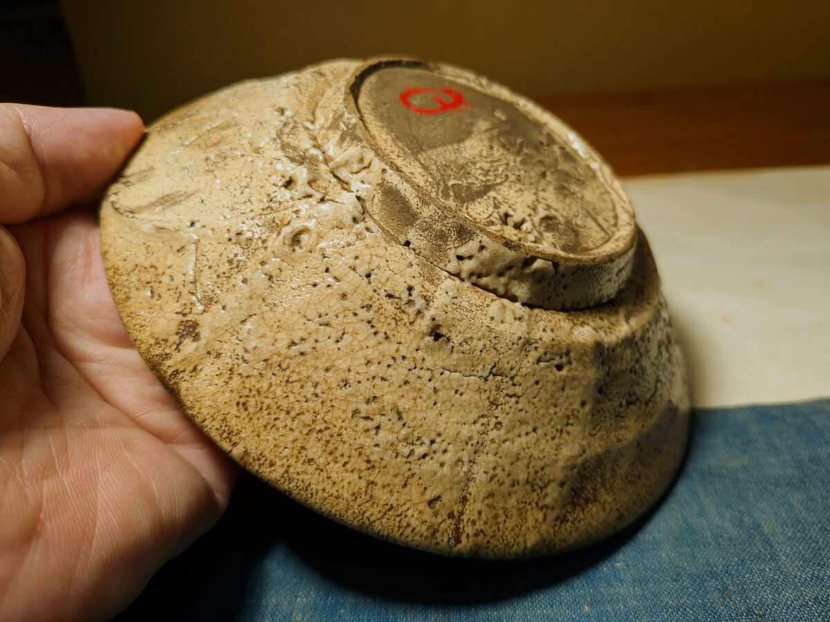 李朝の井戸脇の平茶碗です。味わい深い伝世味になっています。枇杷色、釉の縮れ、貫入味、厚めの器体と井戸の要素を備えています。充分お茶の点てられる深さがあります。高台内にどなたかの花押が朱漆で書かれています。縁にほつれの金直しが3カ所あります。もう少し高台が高く小さめであれば井戸脇から井戸へと昇格と言うところですが、これでも充分井戸の魅力を味わっていただけると思います。抹茶の緑が大変映える李朝井戸脇平茶碗を特別出品です。箱、御物袋あり。・口径14.5〜14.7センチ・高さ3.7〜4センチ・李朝前期 ※新規の方、評価の悪い方の入札は取り消す場合があります。商品到着後は速やかに取引ナビの受取連絡を入れて下さい。