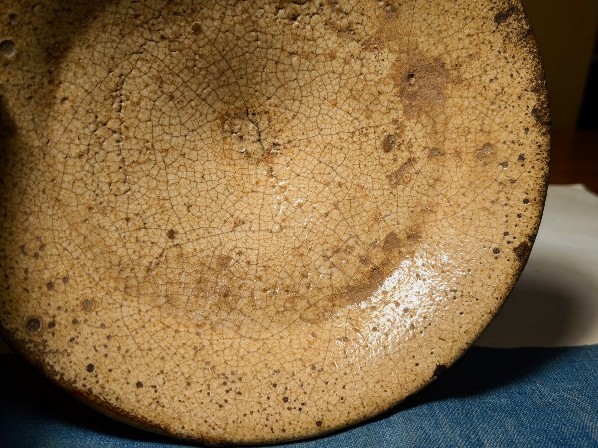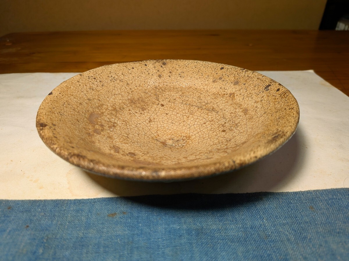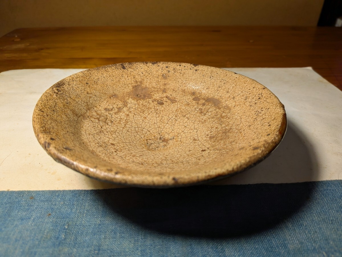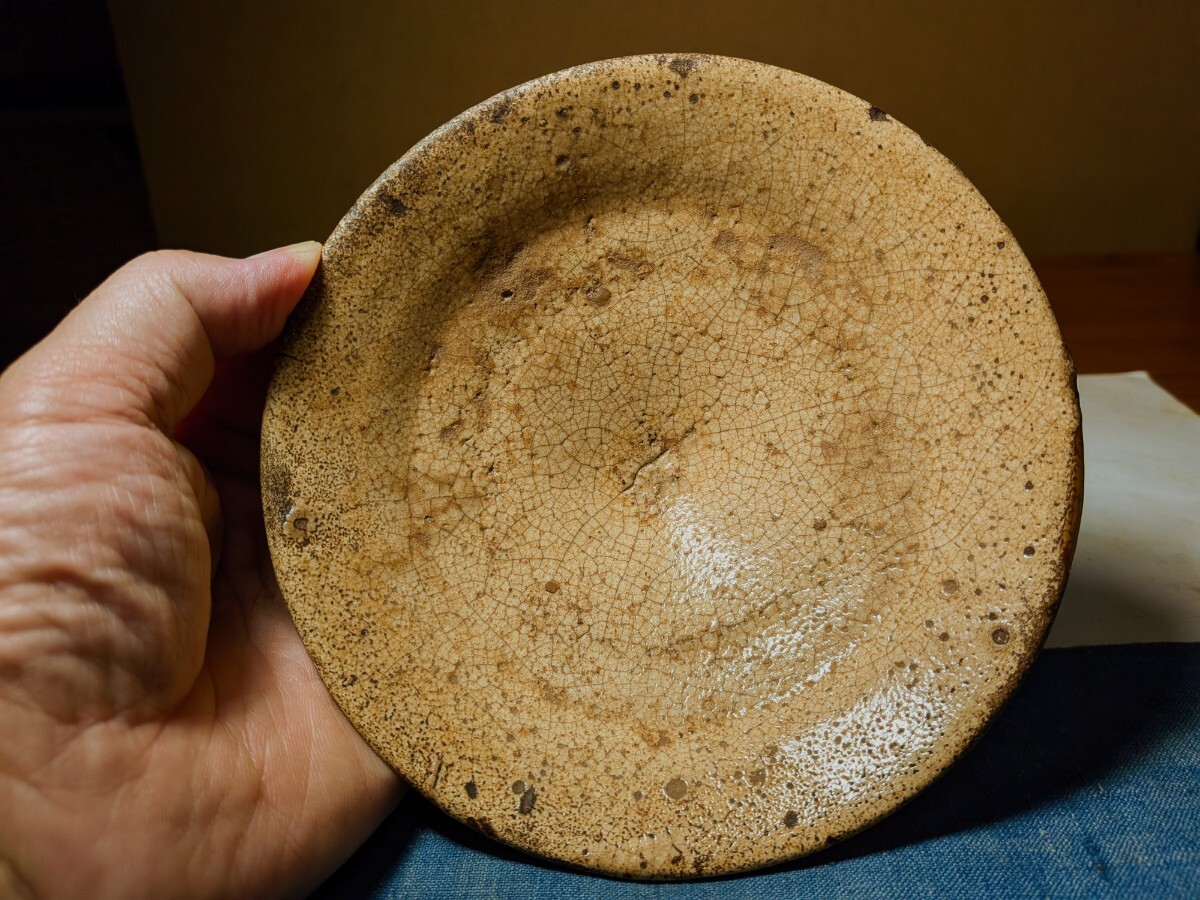 李朝の井戸脇の平茶碗です。味わい深い伝世味になっています。枇杷色、釉の縮れ、貫入味、厚めの器体と井戸の要素を備えています。充分お茶の点てられる深さがあります。高台内にどなたかの花押が朱漆で書かれています。縁にほつれの金直しが3カ所あります。もう少し高台が高く小さめであれば井戸脇から井戸へと昇格と言うところですが、これでも充分井戸の魅力を味わっていただけると思います。抹茶の緑が大変映える李朝井戸脇平茶碗を特別出品です。箱、御物袋あり。・口径14.5〜14.7センチ・高さ3.7〜4センチ・李朝前期 ※新規の方、評価の悪い方の入札は取り消す場合があります。商品到着後は速やかに取引ナビの受取連絡を入れて下さい。