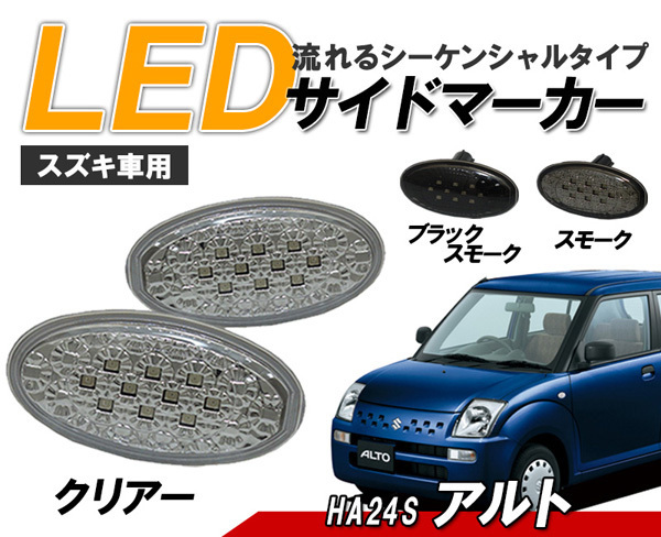 商品番号:D074CL 車種:アルト(HA25・35、36、HA24S) 商品名:LEDサイドマーカー(流れるウインカー) カラー:クリアータイプ ----------- ※ご注文後のカラー変更はご対応致しかねますので ご入札前に必ずカラーをご確認下さい。 ▼ 商品説明 クリスタルアイ新製品 スズキ車種用(適合表要確認) LEDクリスタルLEDサイドマーカー LEDサイドマーカーに流れる シーケンシャルウインカータイプが登場です。 しかも高輝度SMDチップ型LEDを限界の10発で点灯時の明るさと 粒粒にLEDが点灯するサイドビューはインパクト抜群。 ※適合表に記載の無い対応車種もあり お問い合わせください。 ※購入前にLEDサイドマーカーと純正の形が同じか確認してください。 ▼ 商品詳細 ■新品左右セット ■ハイフラ防止抵抗内臓 ■カプラーオン ■高輝度SMD型LED10発仕様 点灯動画はこちら ▼ 適合車種