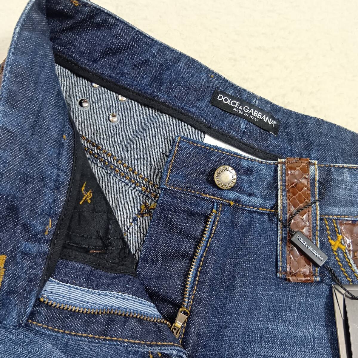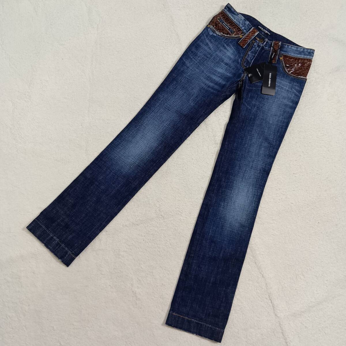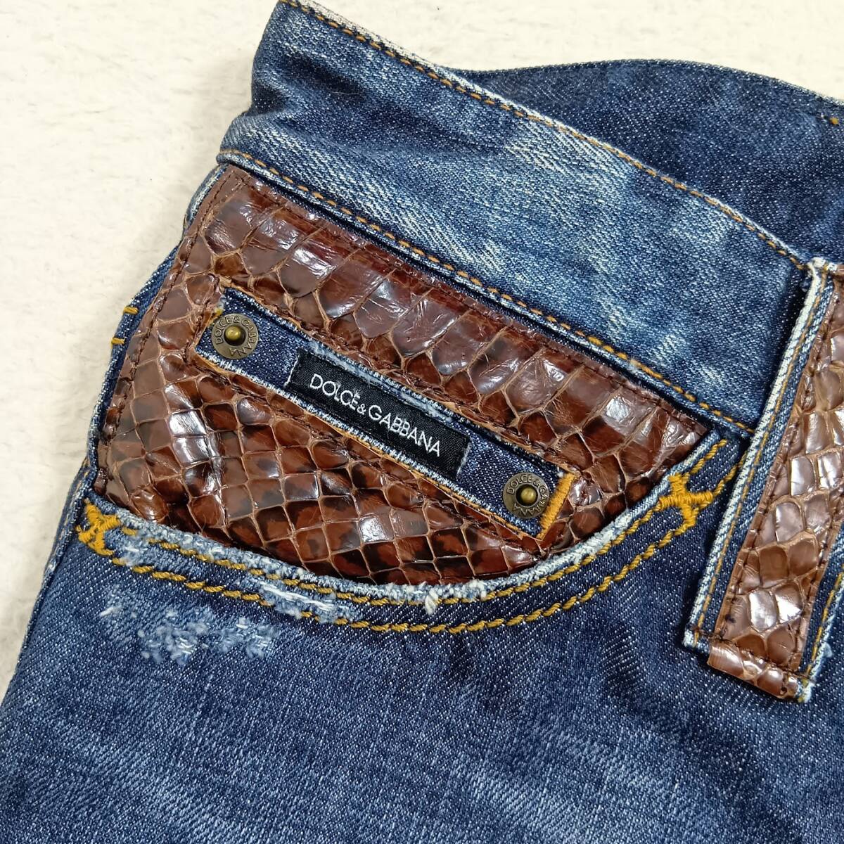 水ヘビ革をポケットとベルトループに使用した高級感溢れるデニムパンツです。