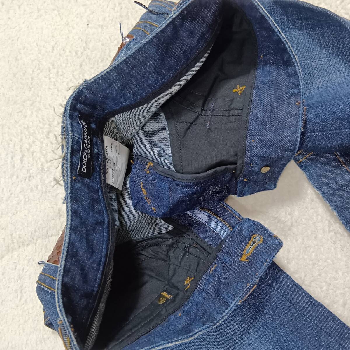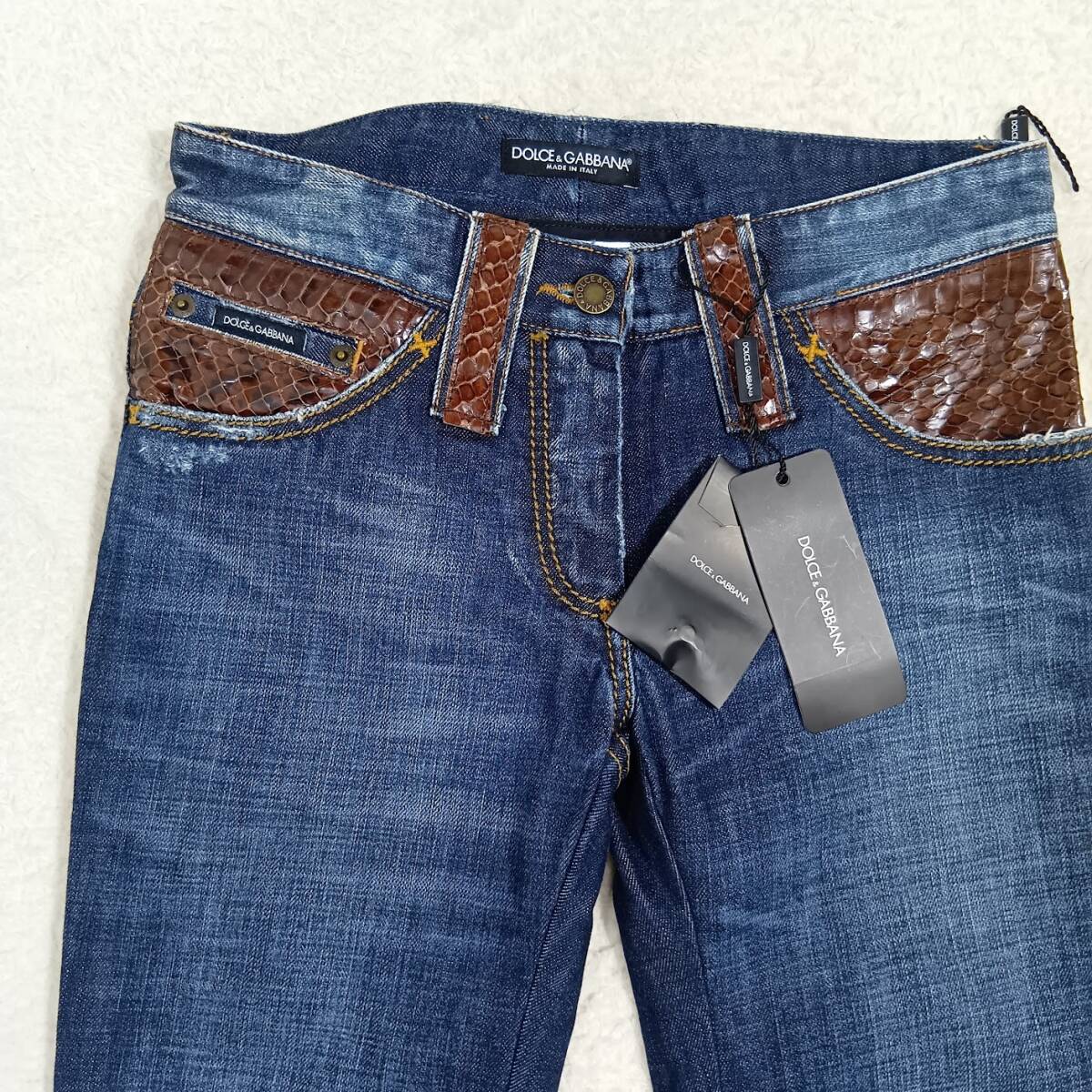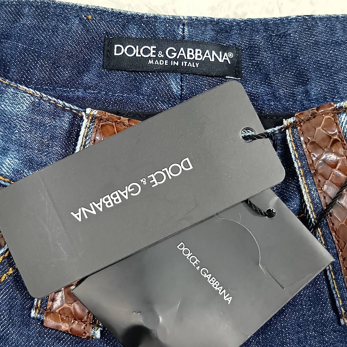 水ヘビ革をポケットとベルトループに使用した高級感溢れるデニムパンツです。