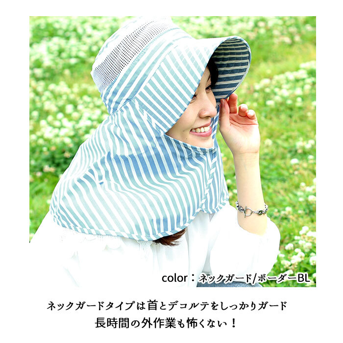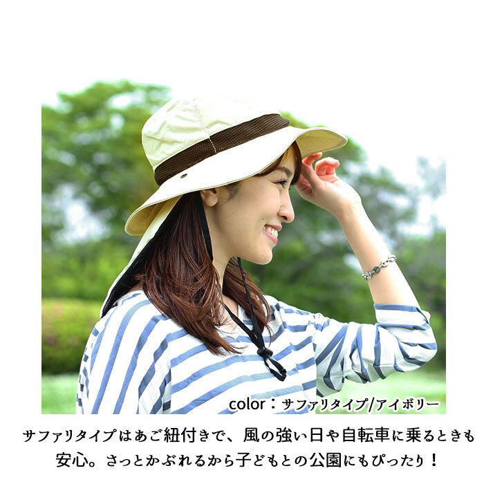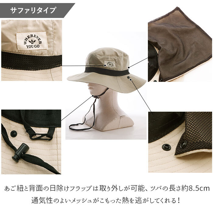 | 素材 | ・サファリタイプ [本体]ポリエステル65%・綿35% ・ハットタイプ [本体]ポリエステル65%・綿35% [ひさし内部]ポリエチレン ・ネックガードタイプ [本体]綿100% [ひさし内部]ポリエチレン | |||||||||||||