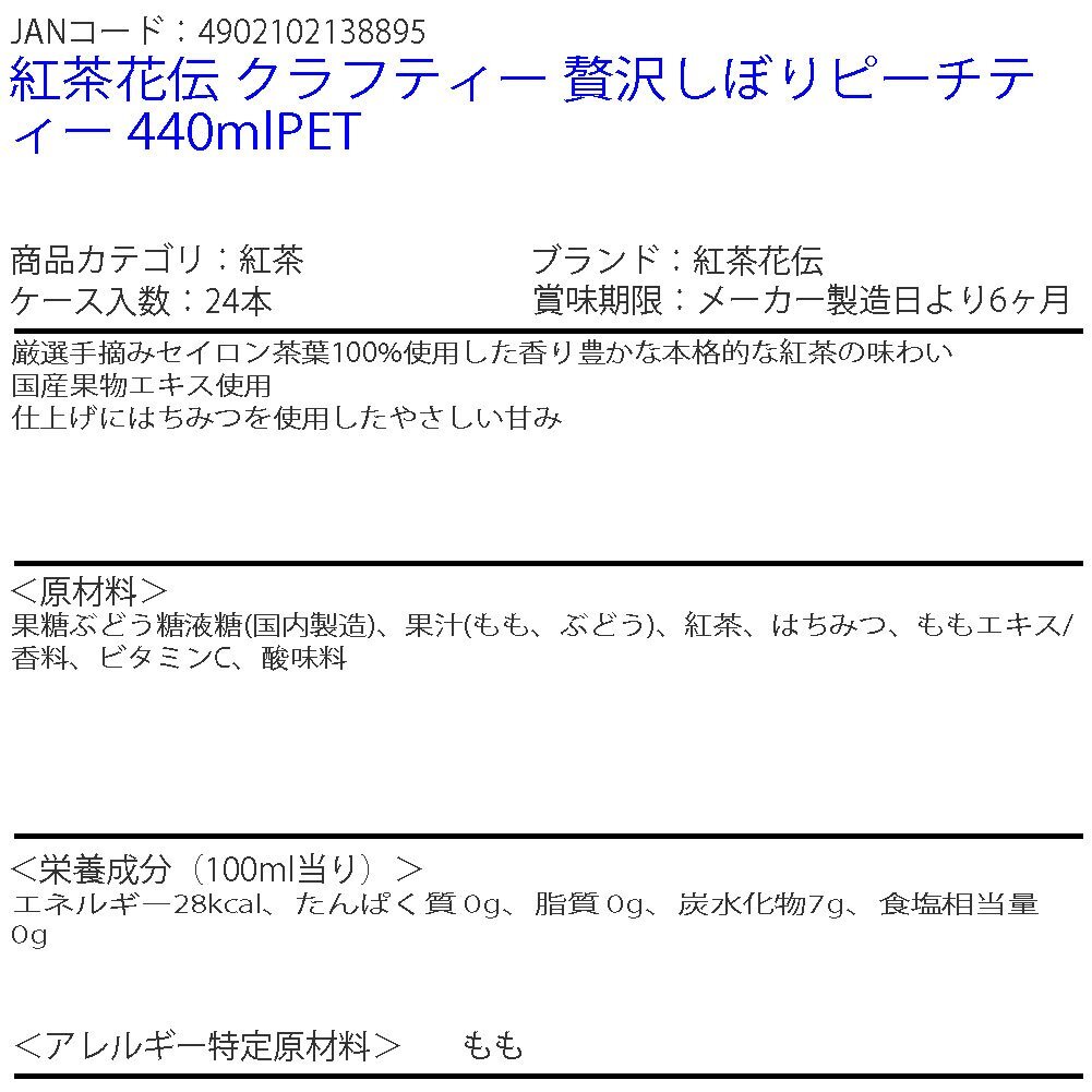 | 商品名 | 紅茶花伝 クラフティー 贅沢しぼりピーチティー 440mlPET | |