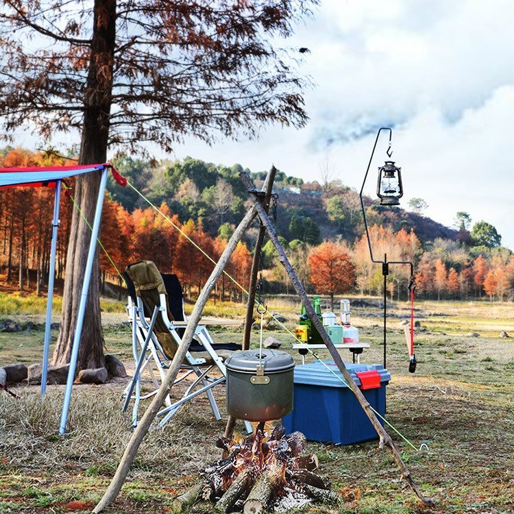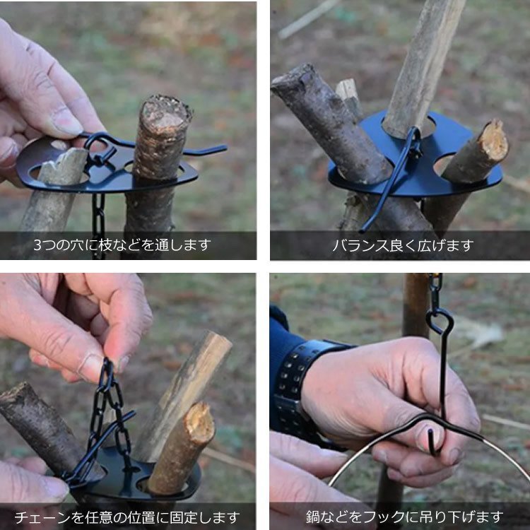 付属のチェーンで鍋ややかんを吊るすことができ、野外での調理や湯沸かしに使用できます。