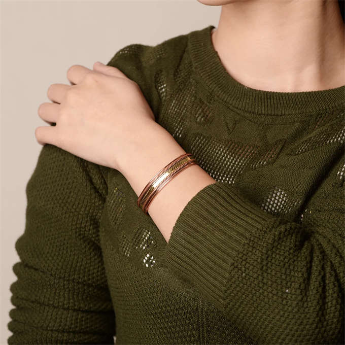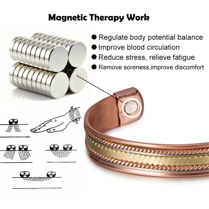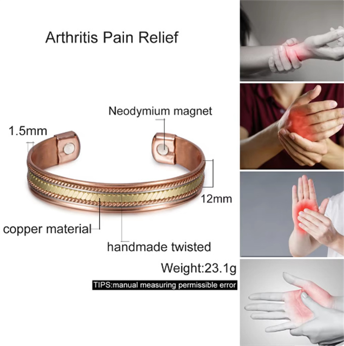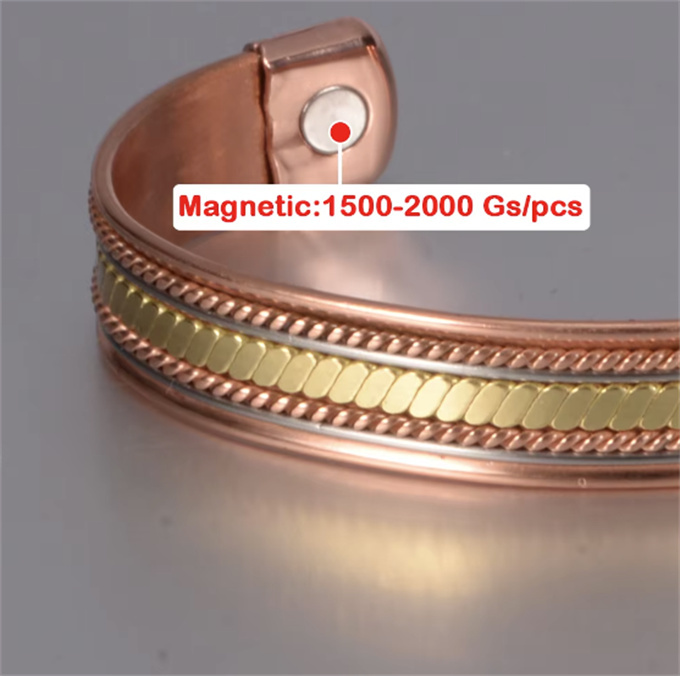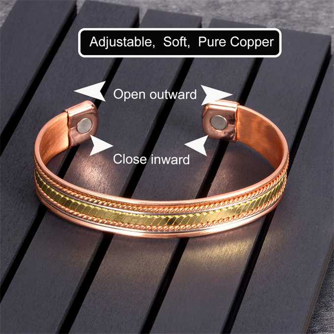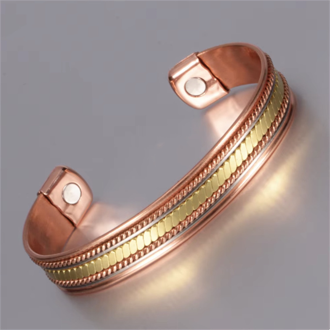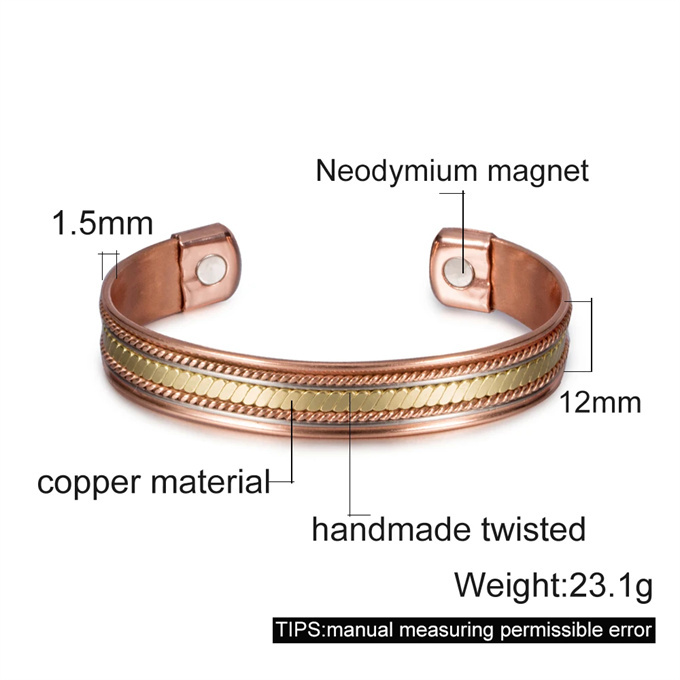 商品情報 素材 99.99% 純銅 ( 赤銅 ) 3500ガウス磁石 ( 6 個 ) サイズ周囲:17.5 cm (直径は自分で調整できます) 幅:1.2 cm 重さ23.1 g 健康効果血行促進: 磁気が体内の血流を改善し、血行を促進します。 疲労回復: 磁気の力が体のコリや疲れを軽減し、リラックス効果をもたらします。 痛みの軽減: 磁気の働きで、関節や筋肉の痛みを和らげることが期待されます。 免疫力向上: 磁気の影響で、体の免疫機能が向上すると言われています。 ただし、これらの効果は個人差があるため、必ずしも全ての方に同じ効果が現れるわけではありません。また、医学的な治療の代替とするものではありませんので、必要に応じて専門医にご相談ください。 商品番号: SSP060