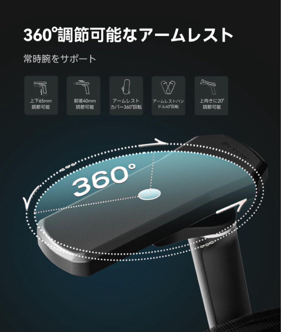 【360°機械式アーム・肘サポート】360°アームレストは肘を保護してサポートすることに目指し、主に65mm昇降、40mm前後、左右40度回転、アームレストは上下20°調節可能、主軸回転に360°調節できるなので、肩と腕の接続部の圧力を緩和させることができる。読書、ゲーム、娯楽などマルチシーンの使用ニーズに柔軟な対応方法を提供します