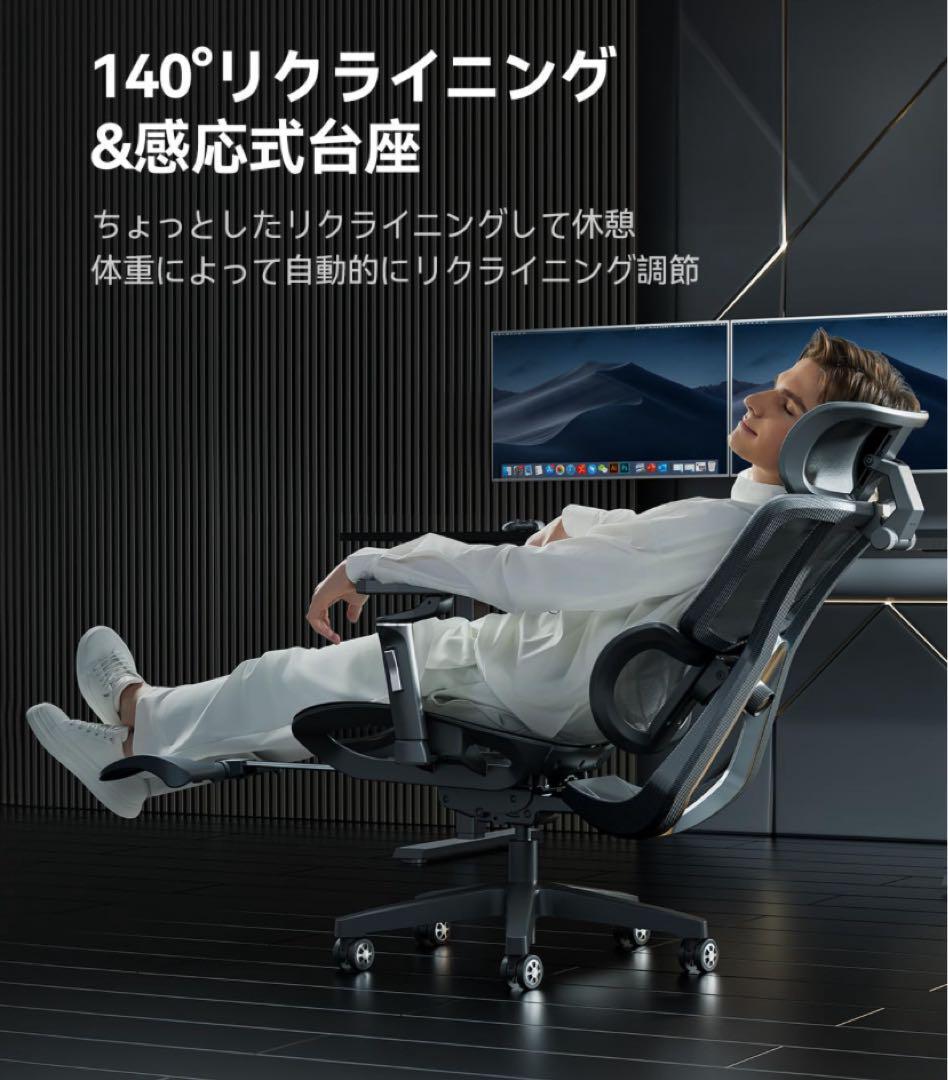 【機能全面・高級感椅子】本椅子は上から4Dヘッドレスト装備して余分な頚支持問題を完璧に解決します。全身特製メッシュ素材で落ちる問題と通気性の問題を解決します。また高級なワイヤ制御台座を利用して耐久性を延長しました。さらに一体化のオットマンと140度リクライニング機能は十分な休憩体験