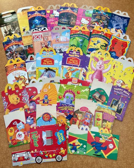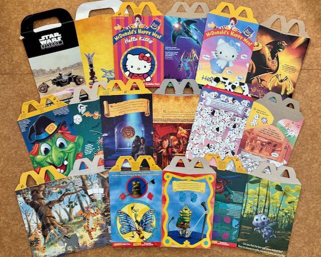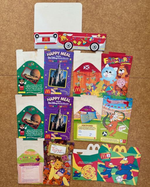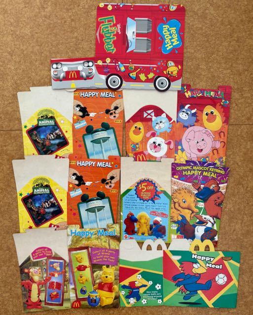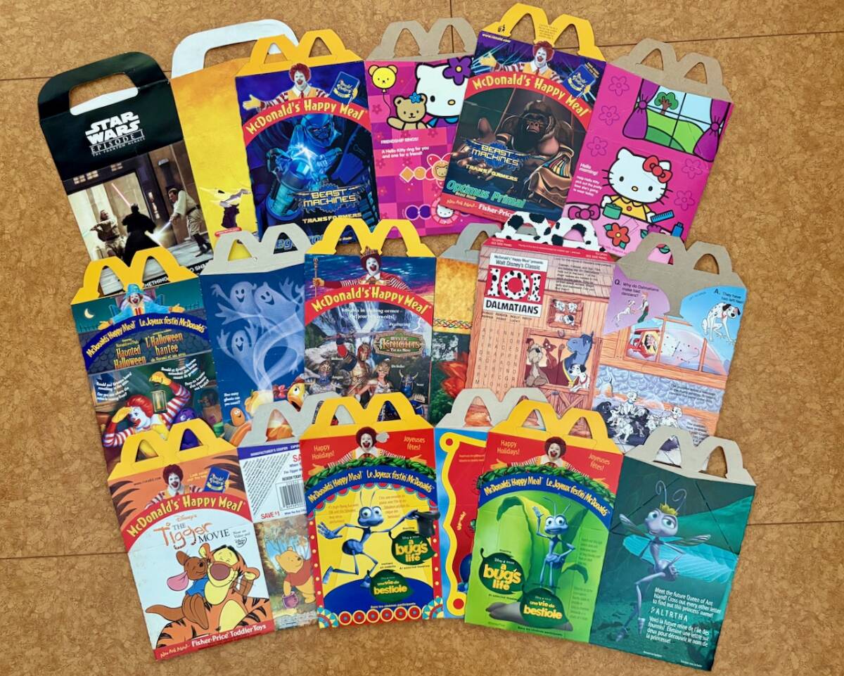 マクドナルドのハッピーミールボックスです、 1990年代後半~2000年頃のもので、オーストラリア、イギリス、アメリカなどから入手したものです。 BEAST MACHINES x Hello Kitty 101 ミスティック・ナイト ティガー・ムービー バグスライフ ハロウィン プーさん フラバー シドニーオリンピック ワールドカップ KFCのスター・ウォーズ、 バーガーキングのキッズミールの箱もあります。 使用していた物もあり、汚れ・シワ・折れ等あります。 画像のもの全部まとめてのお取引をお願いいたします。 :::::::::::::::::::::::::::::::::: 古い物、ヴィンテージ品です。 長期保管していた物で新品ではありません。 キズ、擦れ、印刷の剥がれ、褪色、変色、汚れ、その他経年による劣化等ございます。 ご理解の上、ご検討よろしくお願いいたします。 | ||||||||