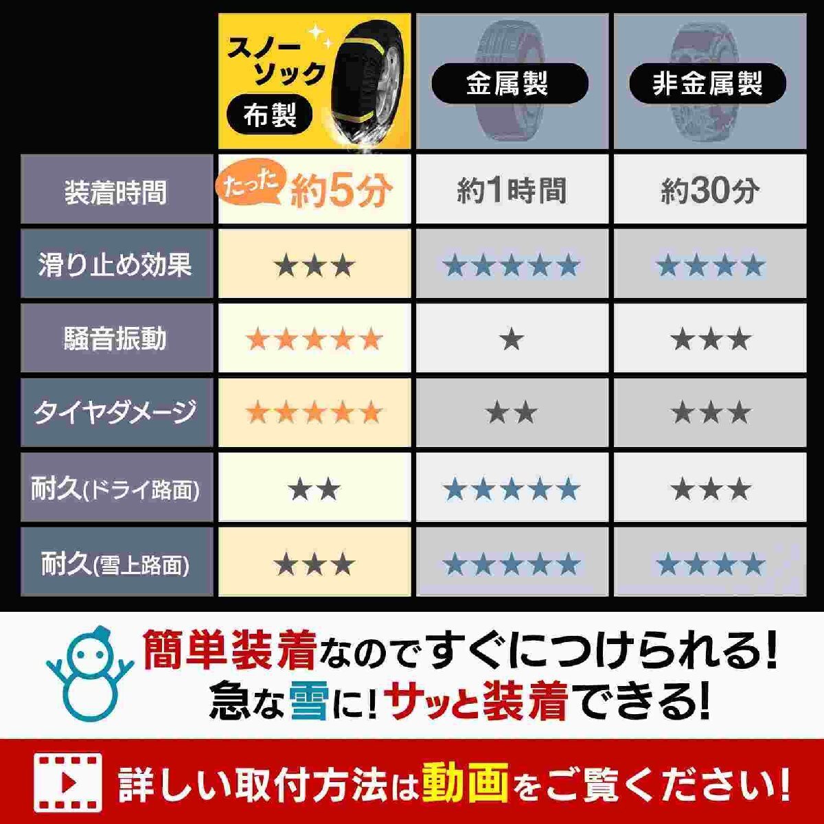 これさえあれば急な積雪も心配無用!タイヤに被せるだけなので女性でも簡単に装着できます。