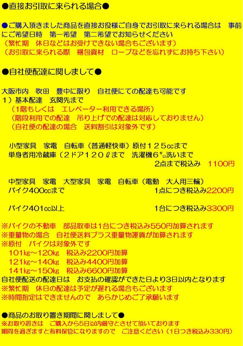 発送に関しまして | こちらの商品は 発送不可です 直接お引取 もしくは自社便(大阪市内 吹田 豊中)対応します |