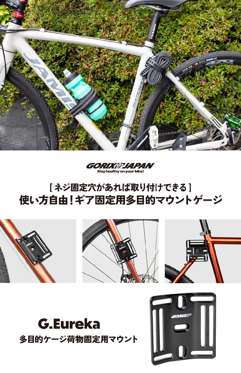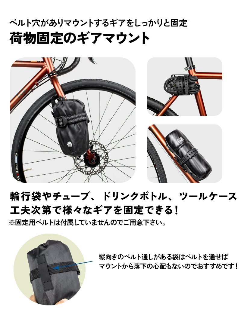 またベルト穴がありマウントするギアをしっかりと固定できます。 ボトルケージや輪行袋など幅広い荷物を固定できる事でできる事の幅が広がります。