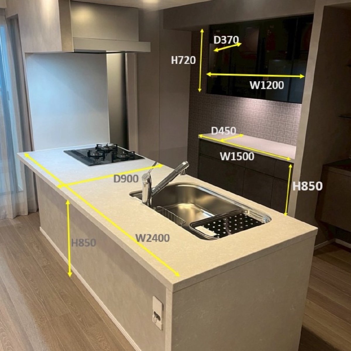 ■キッチン W2400×D900×H850mm ■食器棚 カップボード:W1500×D450×H850mm 吊戸棚:W1200×D370×H720mm |