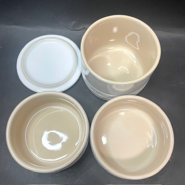 商品説明 積み重ね可能な容器のセットで、食器や小物入れなど多目的に使用できます。 ハート型容器はグラタンやプリンなどの小分け料理、薬味入れに使えます。 詳細 ●サイズ:【ハート型】縦11cm、横11.5cm、高さ6cm 【3段セット】高さ16cm、直径10.5cm ●ランク:Cランク ●コンディション:3段セットの蓋に落ちない汚れがありますが、全体的に綺麗な状態です。 |