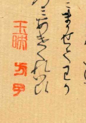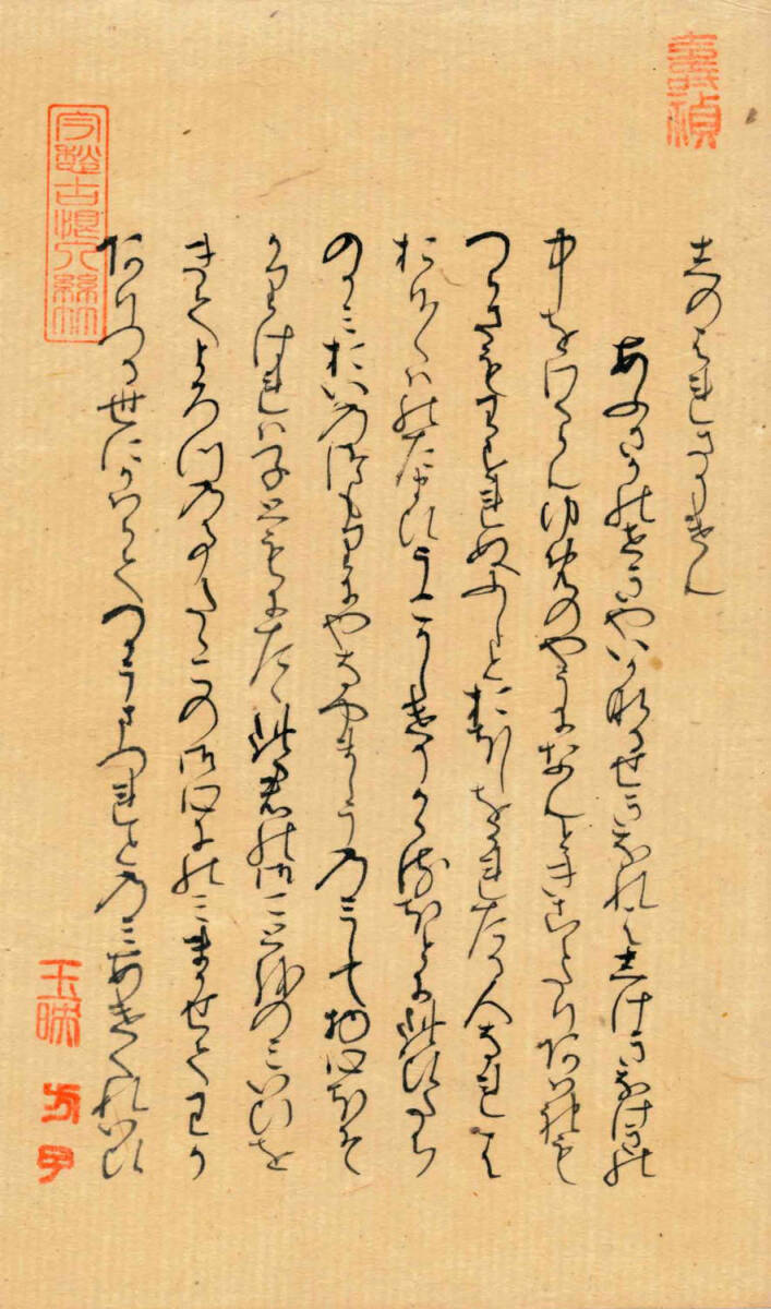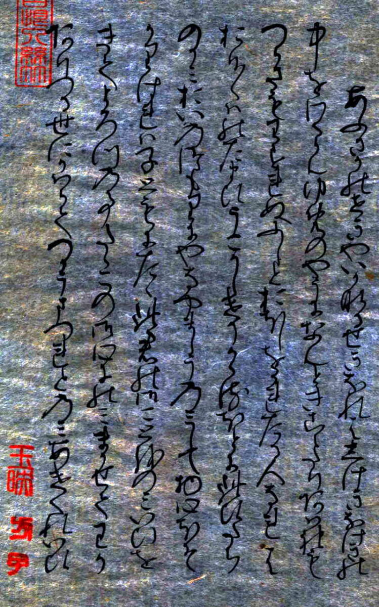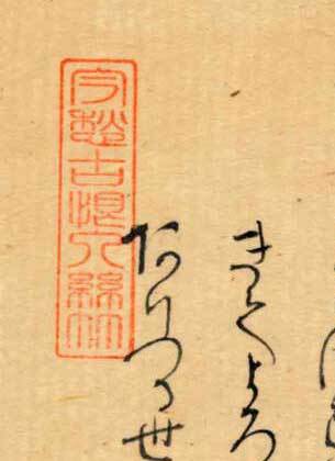 「関屋(せきや)」原本自筆上部には、「今愁古恨入絲竹」《今の愁(うれ)い古(いにしえ)の恨み糸竹(しちく)に入る》という漢文の篆書印が押捺されている。言葉の意味は、「今人の愁い、古人の悲しみ、楽の音に籠(こも)る」という内容です。紫式部がこの原詩に親しんでいたことがわかる。