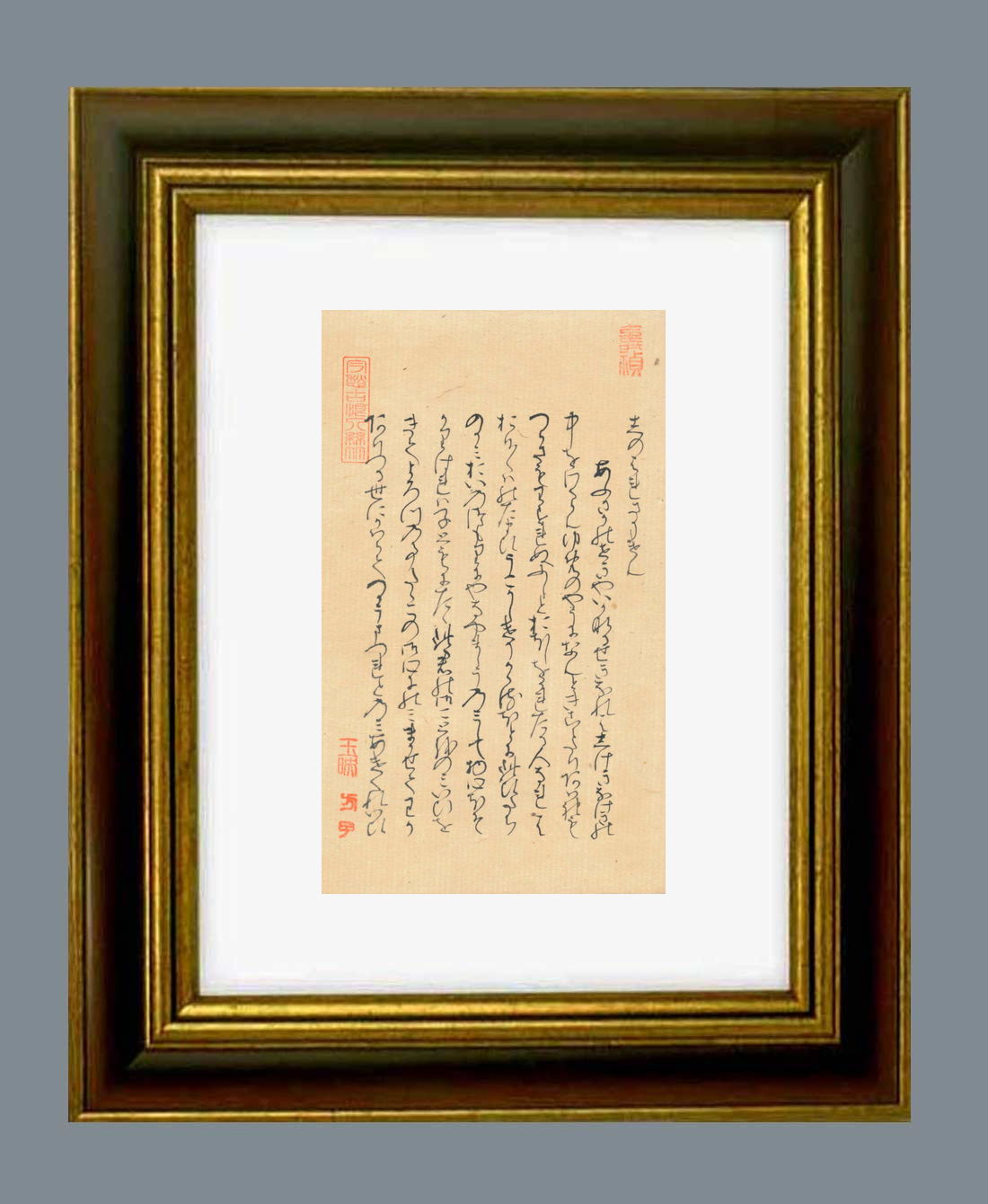 「源氏物語」自筆の大きさ タテ21.8センチ ヨコ12.8センチ。額縁の大きさは タテ37.0センチ ヨコ28.0センチです。額縁は新品です。 |