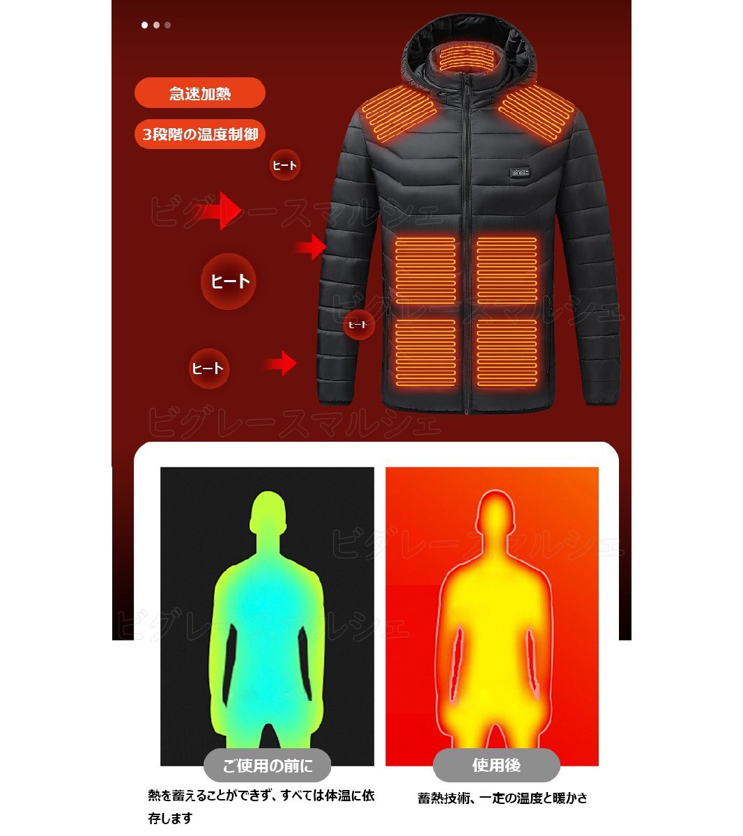 ■ 【3段階温度調節 前後独自制御】二つの制御ボタンを備え、前(7つ)・後(14つ)別々に設置することができます。温度調節は、高温(55℃)・中温(45℃)・低温(38℃)と3段階から切り替えられ、ボタンの色[赤(高温)・白(中温)・青(低温)]で判別できて分かりやすい。前後21箇所を同時に温めることができれば、前か後ろだけ発熱させることも可能で、気温や使う場面に応じて使い分けできます。