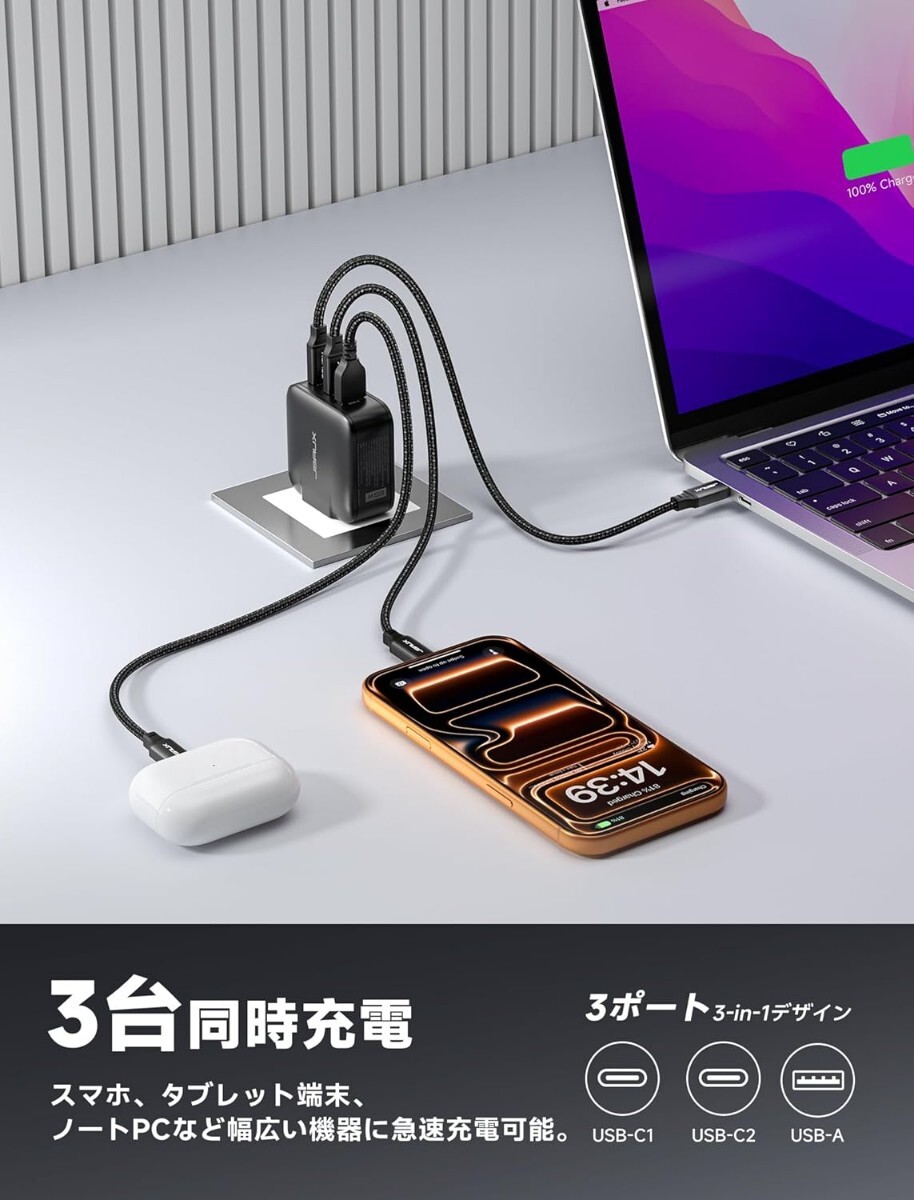 USB C×2ポートとUSB-A×1ポートを搭載し、最大3台のデバイスを同時に充電可能。賢く電力を分配し、MacBook、iPhone 17、Galaxy、Switch 2などをスピーディーに充電します。
