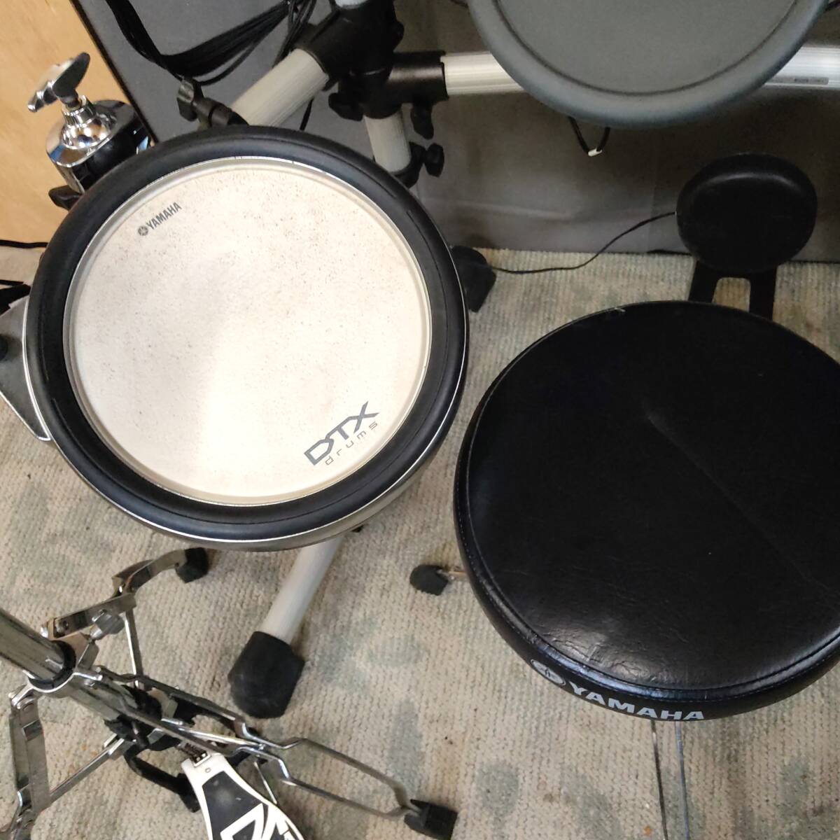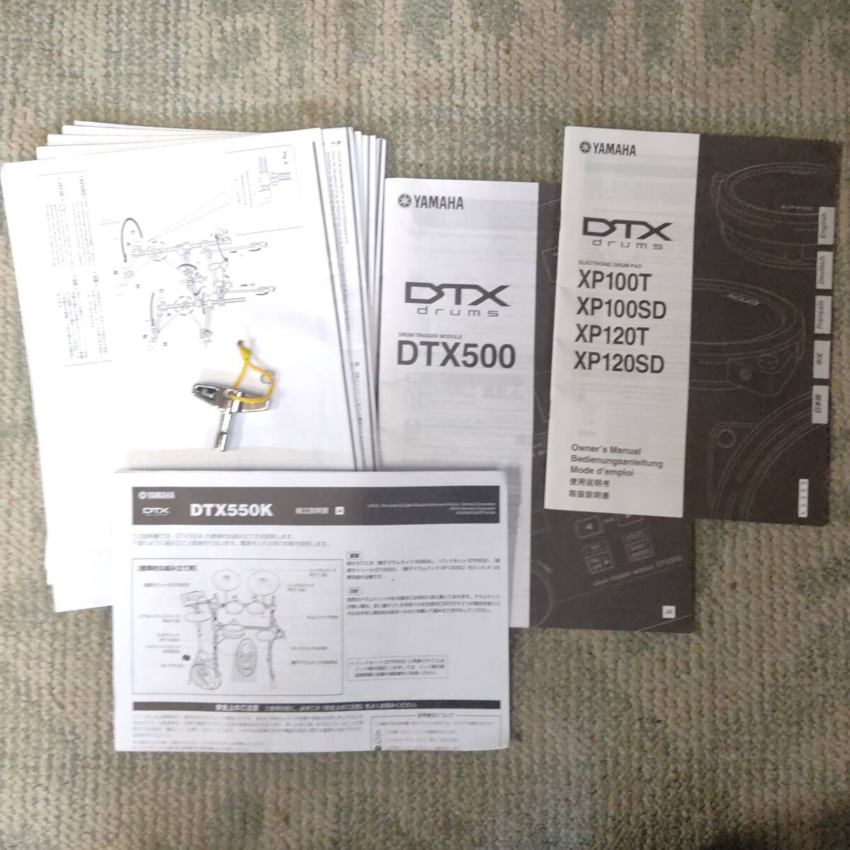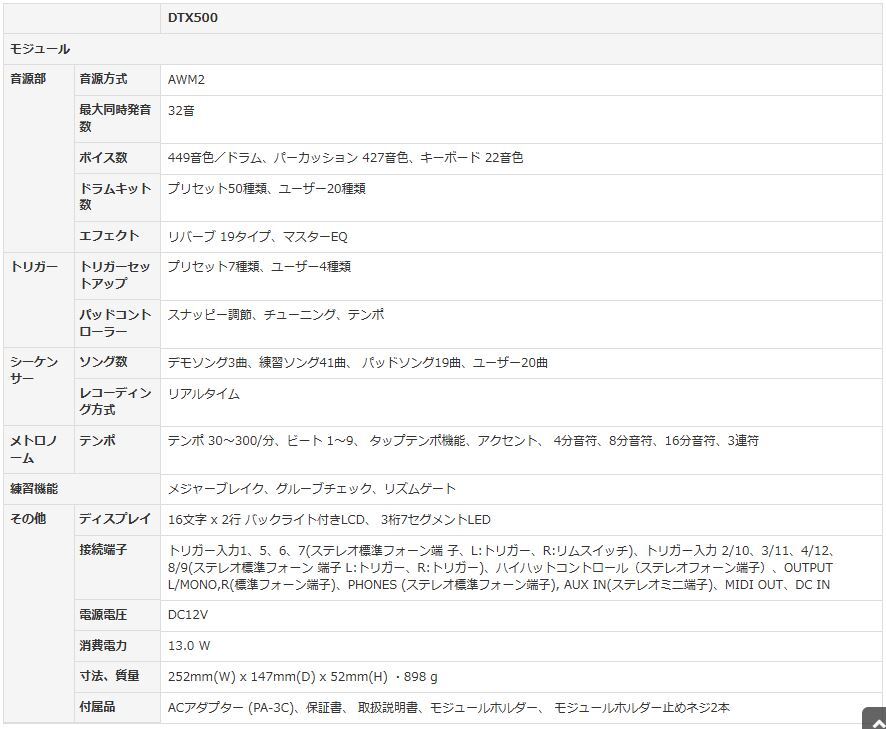 電子ドラム一式 メーカー:YAMAHA/他 型番:DTX550K/他(下記詳細) ・DTX550Kセット内品 モジュール:DTX500 ラックシステム:RS85A スネアパッド:XP100SD ハイハットパッド:RHH135 タムパッド3点:TP65 シンバルパッド:PCY135/PCY155 キックパッド:KP65 パッド接続用ケーブル AC電源ケーブル ・DTX550Kセット以外の品 ハイハットスタンド:TAMA/THE LEGEND IN INNOVATION フットペダル:Pearl製ツインペダル チューニングキー:Pearl製 椅子:YAMAHA製スローン モジュールDTX500の仕様は画像2枚目をご参照ください。 DTX550Kの商品概要ページ(取扱説明書)はコチラ↓ https://jp.yamaha.com/products/musical_instruments/drums/el_drums/drum_kits/dtx550k/index.html | |