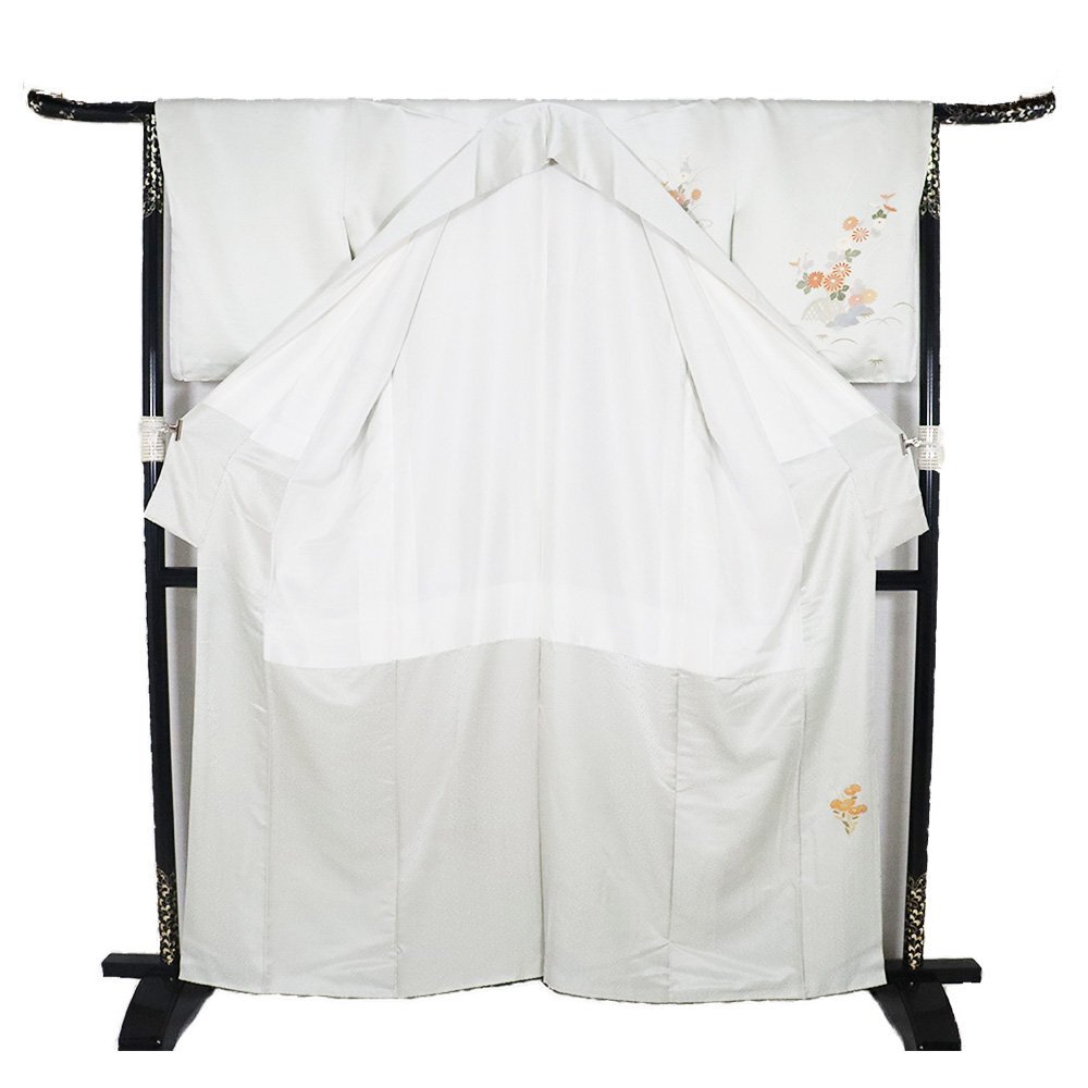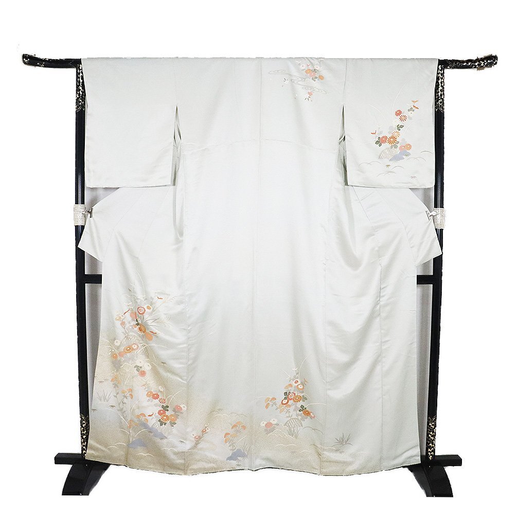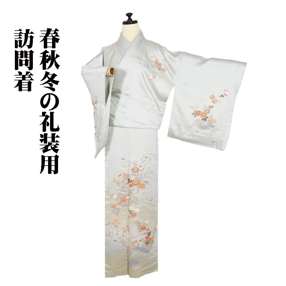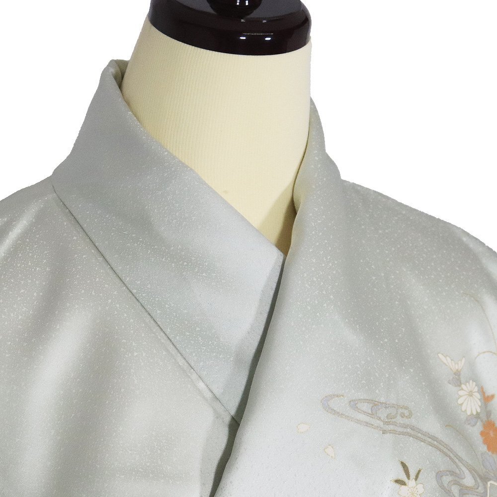 | 商品 | 訪問着 袷 丹後縮緬地 極薄緑(灰黄緑色)暈し・ しぼ綸子地 菊・桜・ススキ・オミナエシ・笹・芝草 167 広襟 仕付け付き |