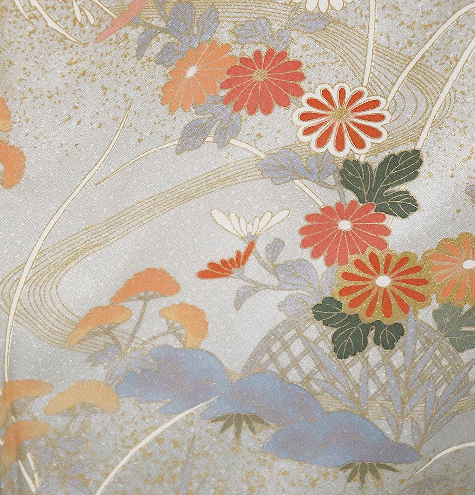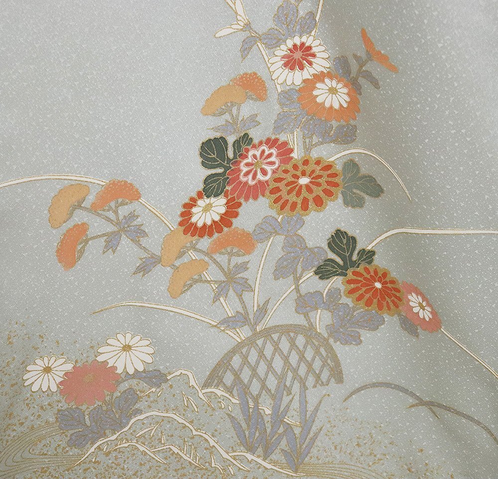 訪問着 袷 丹後縮緬地 極薄緑(灰黄緑色)暈し・ しぼ綸子地 菊・桜・ススキ・オミナエシ・笹・芝草 (写真では上手く色が出ない場合があります。ご了承下さい) |