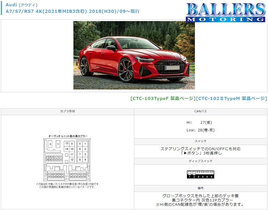 適合車種 | ■メーカー: Audi / アウディ ■車種: A7/S7/RS7 4K(2021年MIB3含む) ■年式: 2018(H30)/09~ ■備考: 製品画像7枚目、備考欄要確認 |
