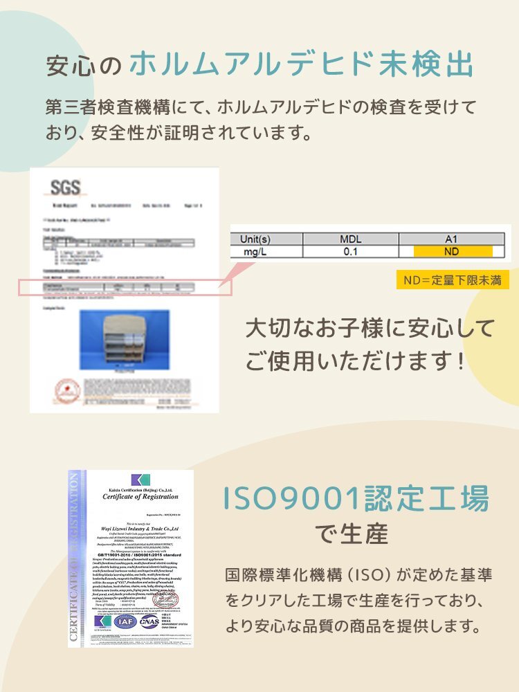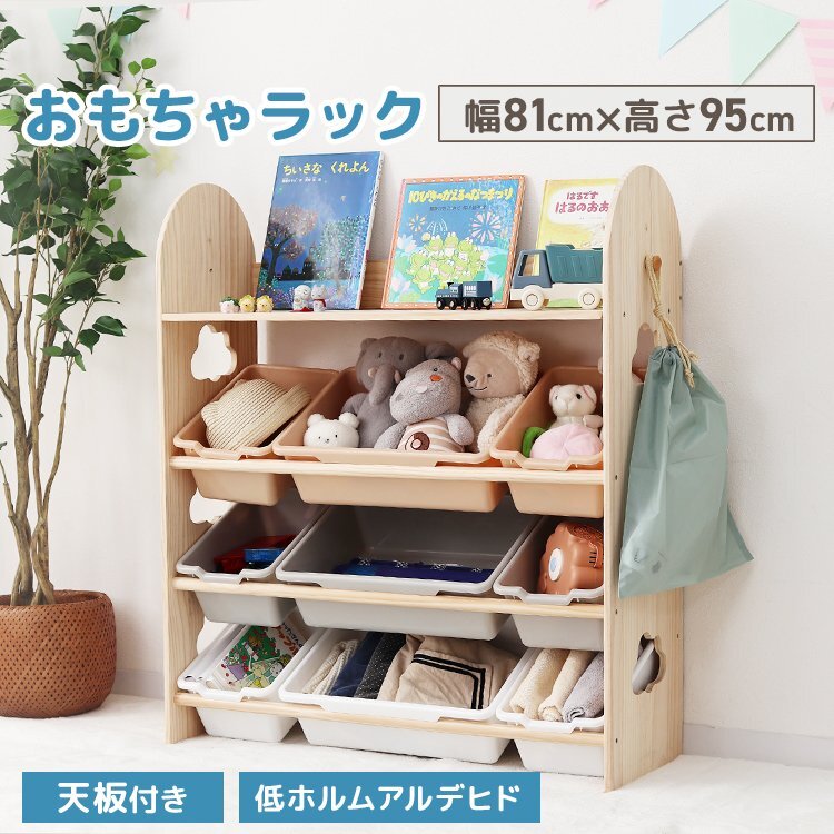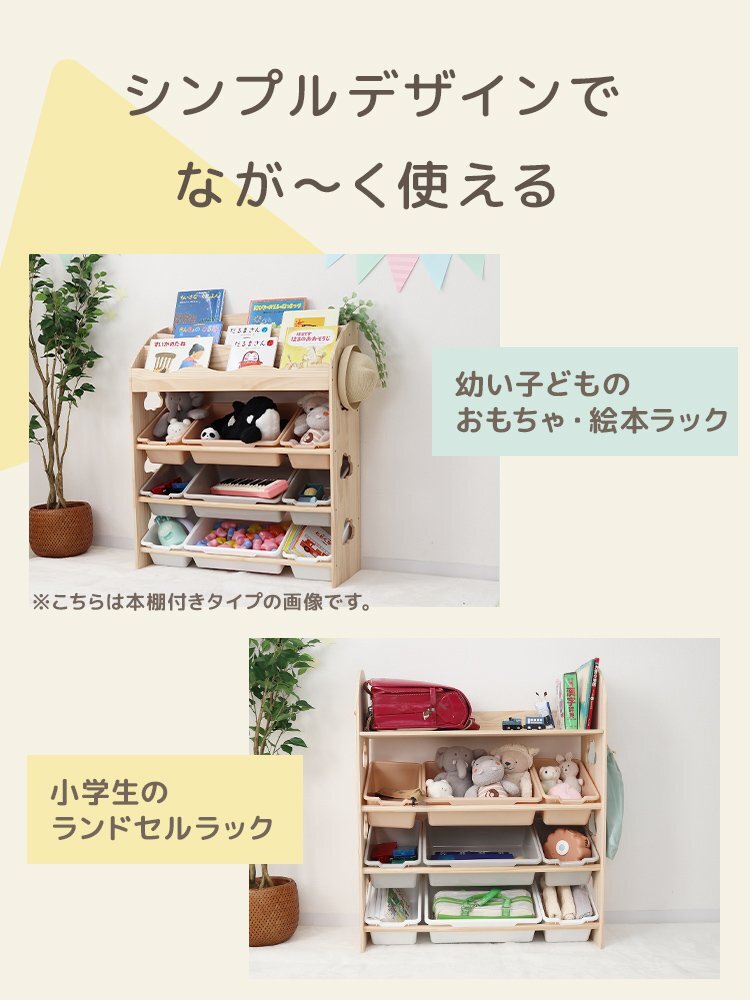 \収納力抜群!/ 柔らかい手触りと温かみのある天然木製 お子様に優しい角丸設計で安心! おもちゃや本の収納に最適な「片付けたくなる」おもちゃラックです。 【商品の特徴】 ・収納力抜群な9個のボックス ・片付けやすい見える収納 ・取り出しやすい ウェーブ状だからケガしにくい ・水洗いOK ・耐久性の高い素材を使用 手前に傾斜した収納カゴは、中身が見やすくおもちゃを種類別に整理することも可能なので、お片付けの習慣を身につけられます。 また、天板付きなのでランドセルを置いたり、ぬいぐるみを飾ったりと、多彩な使い方も。 絵本棚も付いており、お気に入りの絵本を収納することができます。 両側には取り外し可能なフックが付いており、巾着袋や小物を掛けることができます。 倒れ防止パーツや滑り止めとフローリング傷防止用のシールも付属しているため、安心して使用することができます。 JIAホルムアルデヒド検査済みで安心安全。 スリムで場所も取らないから、リビングに置いて大人も子どもも一緒に使えます。 【商品仕様】 タイプ:天板付き サイズ:(約)幅81×奥行30.5×高さ94cm ※BOX(小):(約)幅15.5×奥行25×高さ12.5cm ※BOX(大):(約)幅34.5×奥行25×高さ12.5cm 耐荷重:天板:(約)15kg 収納BOX1段につき:(約)15kg(BOX小:(約)4.5kg、BOX大:(約)6kg) 重量:(約)7.35kg 材質:おもちゃラック:天然パイン材/BOX:PP素材(ポリプロピレン) 【注意事項】 ・商品は、モニターによって色合いが異なって見える場合があります。 ・仕様・デザインは改良のため予告なく変更することがあります。 |