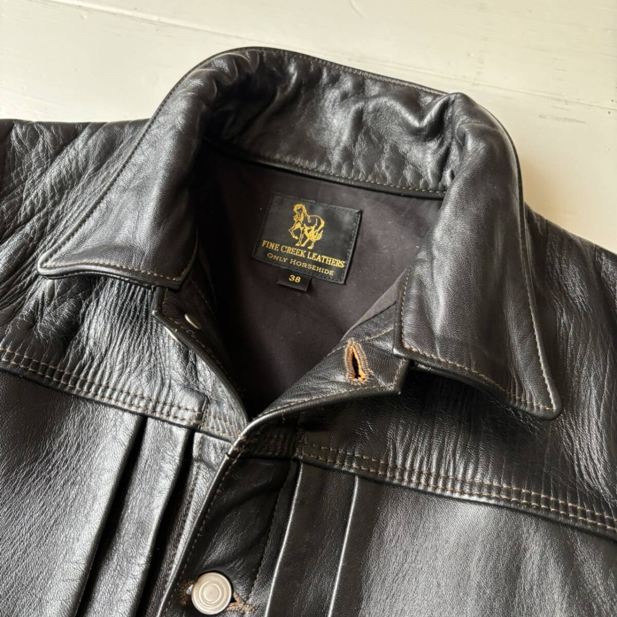 ファインクリークレザーズ リッチモンド レザージャケット 状態: 美品 コンディション良好! カラー: BLACK ブラック 黒 表記サイズ: 38 (メンズ Mサイズくらい) 実寸: 肩幅 43cm 身幅 51cm 着丈 61cm 袖丈 63cm 素材: ホースハイド 馬革 『 FINE CREEK LEATHERS Richmond ファインクリークレザーズ リッチモンド レザージャケット 』 ・FINE CREEK LEATHERS【Richmond / リッチモンド】Gジャンのかたちをまさかのホースハイドで。ワークウェア代名詞Gジャンの形にホースハイドを落とし込むため、試行錯誤を繰り返しオリジナルレシピで完成した1.2mm厚、フルベジタブルタンニン渋鞣し、アニリン仕上げのホースハイドを使用。 ・パターン、カットを細部まで見直し、現代にあったシルエットになっております。最高の革馴染み、驚きの着心地、経年変化を存分に楽しめるFINE CREEK LEATHERSの代表作です。 ・新品購入後に着用しましたのでシワ等の着用感はありますが、汚れ等もなくとても綺麗な状態です。レザー特有の着用による角端の削れも少ない状態です。これからまだまだエイジングを楽しんで頂けます。ユーチューブで着用年数の動画をアップしている方もいますので是非ご参照ください。 ・正規販売店での購入商品です。 ・発送時は、梱包のため折り曲げて発送することになります、ご了承ください。 【FINE CREEK LEATHERS】(ファインクリークレザーズ) 『馬革の可能性を追求する』というブランドコンセプトを掲げ、ホースハイドを使ったアイテムのみをリリースしております。 アメリカンヴィンテージのディテールや意匠を踏襲しながらも、この形を作るのには、この馬革じゃないといけないという信念のもと、アイテムによって仕様や仕上げの異なる馬革を使い分け、『そのアイテムに合った最適解の馬革』を求め続けています。 ファインクリークレザーズのアイテムは、馬革で作ったアメリカンヴィンテージで留まることなく、『最高の馬革』を『最高の形で提供』するためにパターンやシルエット、細かな仕様をモディファイしております。 そして、最高の革ジャンを実現するために、ヴィンテージを取り入れた『ホースハイドジャケットの進化系』としての高みを目指し、山崎さんを筆頭に馬革のスペシャリストが集結したこだわりを存分に味わえる素晴らしいブランドです。 | ||||