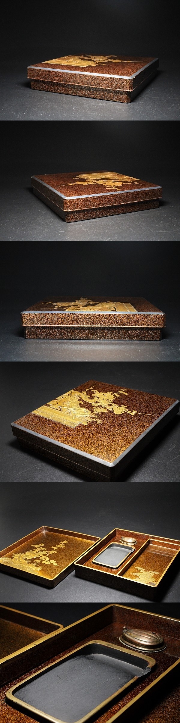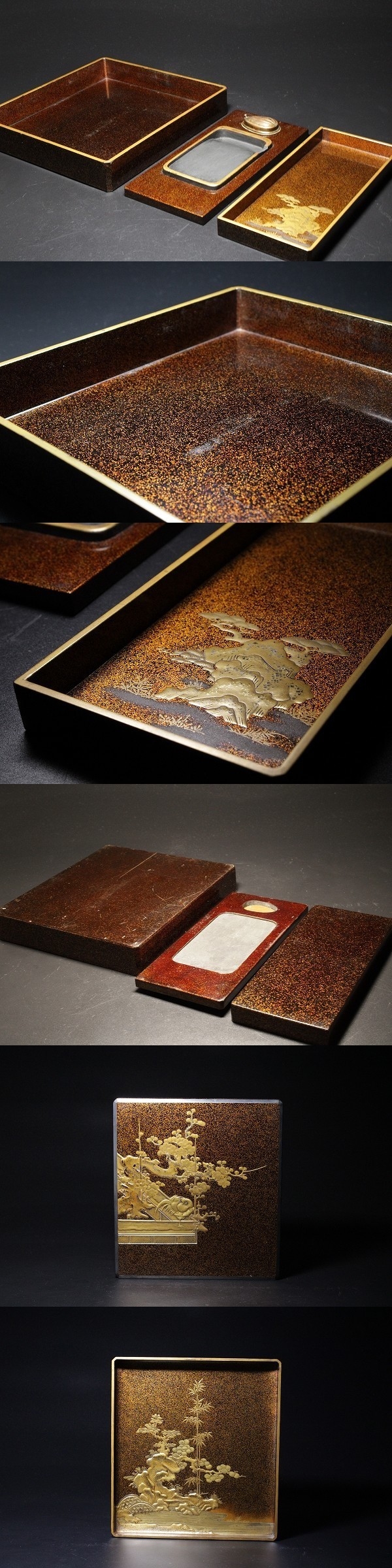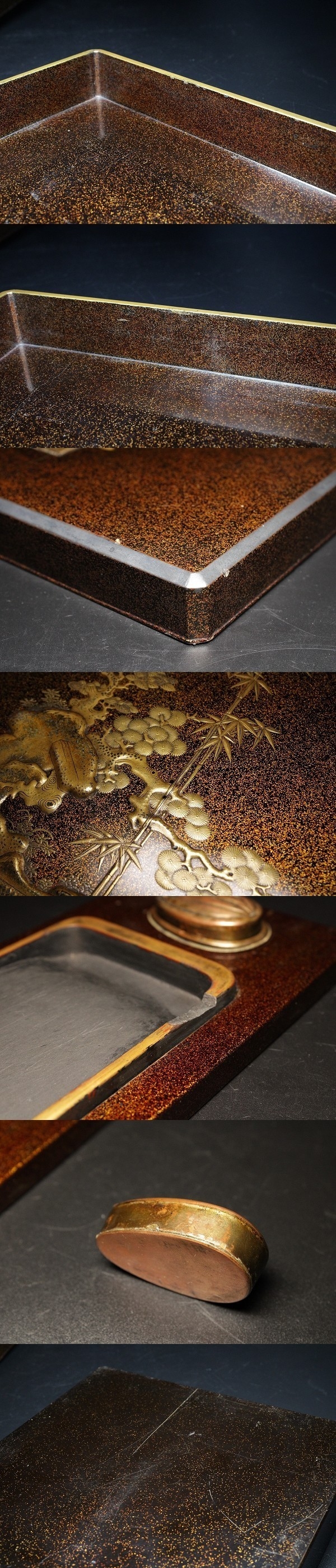 商品説明 | 状態 : 時代物という事もあり、小さなホツ・古い小さな修繕・裏面スレ・水滴の修繕跡・硯の欠け・見開きの丁度竹の蒔絵に沿ってクラックが生じております。 表面には通っていません。 所々見られますが、特に大きな傷はなく、状態は非常に良好です。 画像にてご確認下さいませ。(画像最下部) 経年による奥ゆかしさと、雅な雰囲気が品格となって表れた逸品です。 技法も素晴らしく、様々な技巧で各所に丁寧に仕上げられています。 書道にはもちろん、インテリアとしても十分お使いいただけます。 中々お目に掛かれないと思いますので、この機会に是非如何でしょうか。 径 20.8cm×22.4cm 寸法 : 高さ 4.6cm 箱 : 無し |