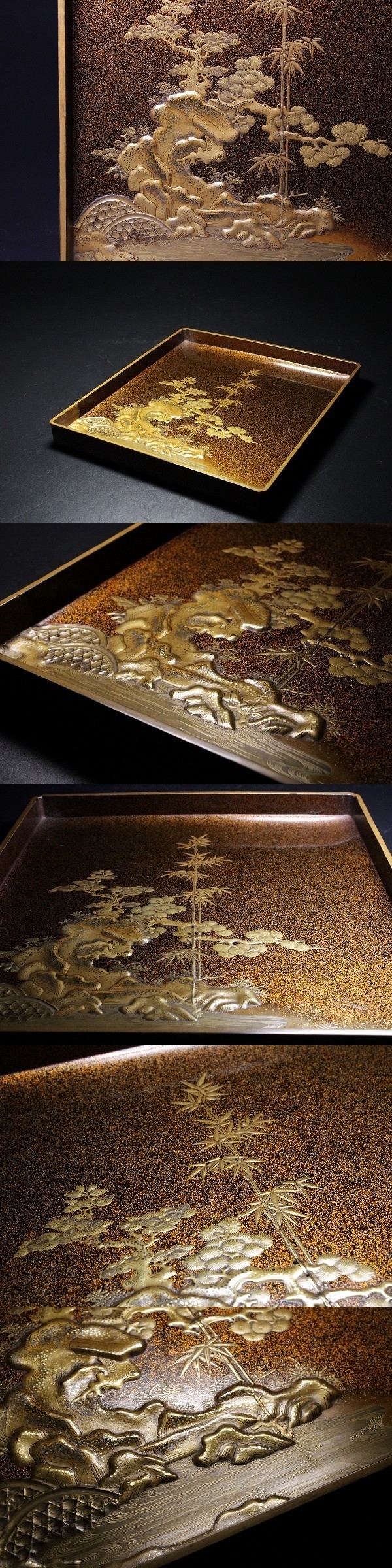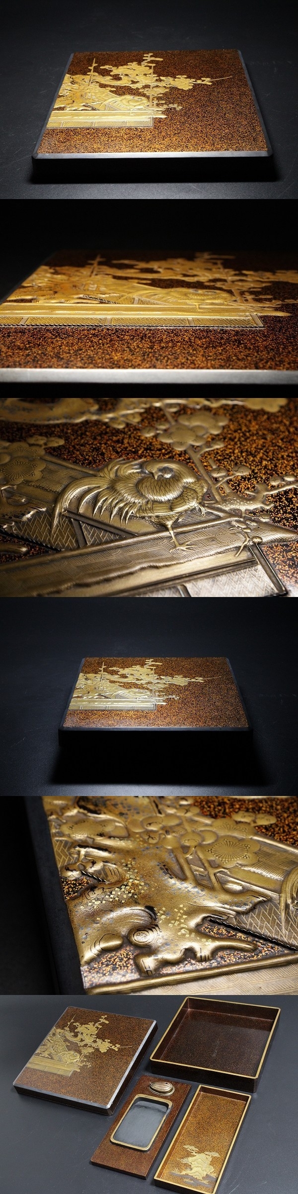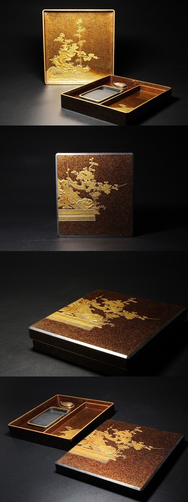 商品説明 | 状態 : 時代物という事もあり、小さなホツ・古い小さな修繕・裏面スレ・水滴の修繕跡・硯の欠け・見開きの丁度竹の蒔絵に沿ってクラックが生じております。 表面には通っていません。 所々見られますが、特に大きな傷はなく、状態は非常に良好です。 画像にてご確認下さいませ。(画像最下部) 経年による奥ゆかしさと、雅な雰囲気が品格となって表れた逸品です。 技法も素晴らしく、様々な技巧で各所に丁寧に仕上げられています。 書道にはもちろん、インテリアとしても十分お使いいただけます。 中々お目に掛かれないと思いますので、この機会に是非如何でしょうか。 径 20.8cm×22.4cm 寸法 : 高さ 4.6cm 箱 : 無し |
