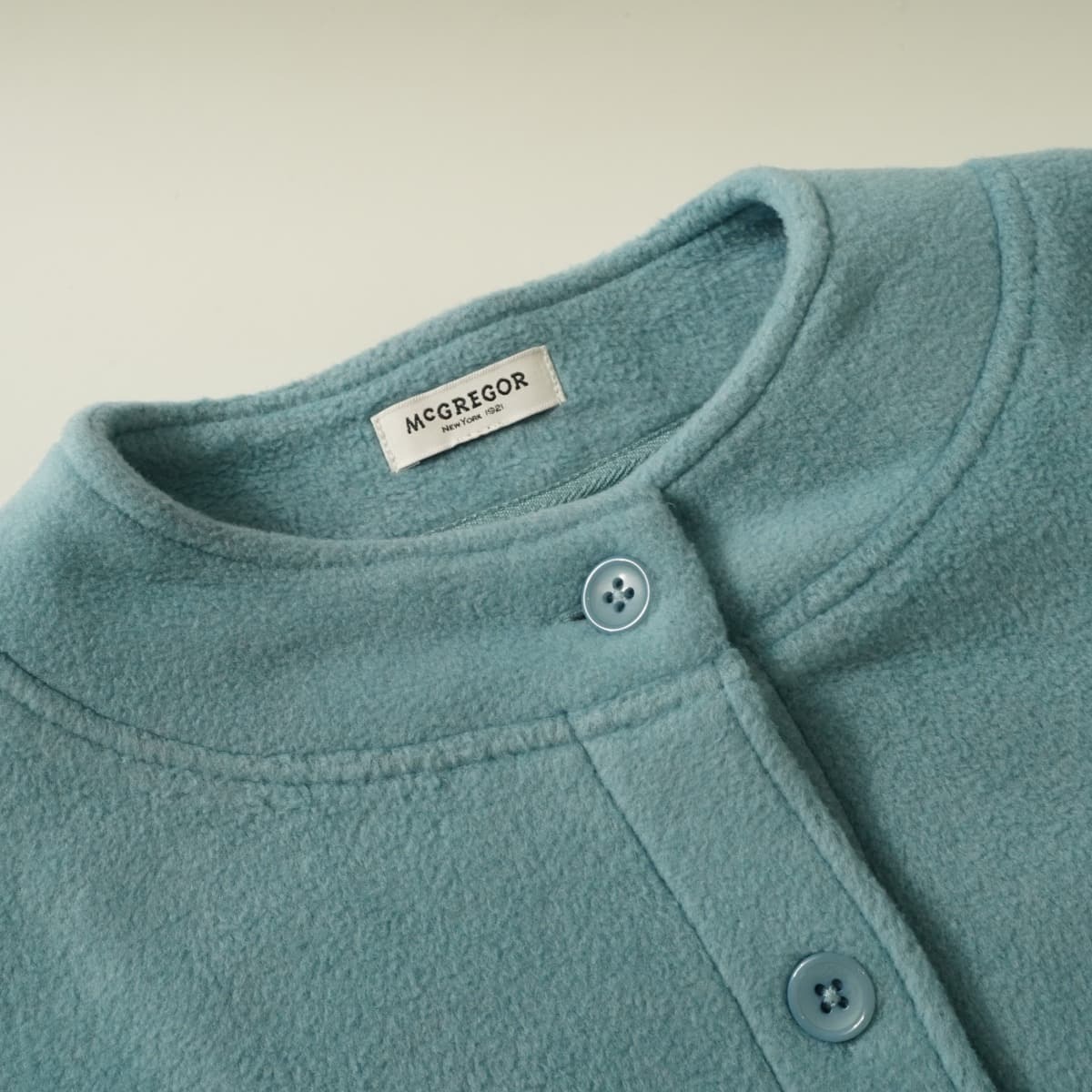 コメント:大きめのフロンド釦がアクセントの肌触りがよく軽い上品な毛並みのフリース素材のブルゾンです。