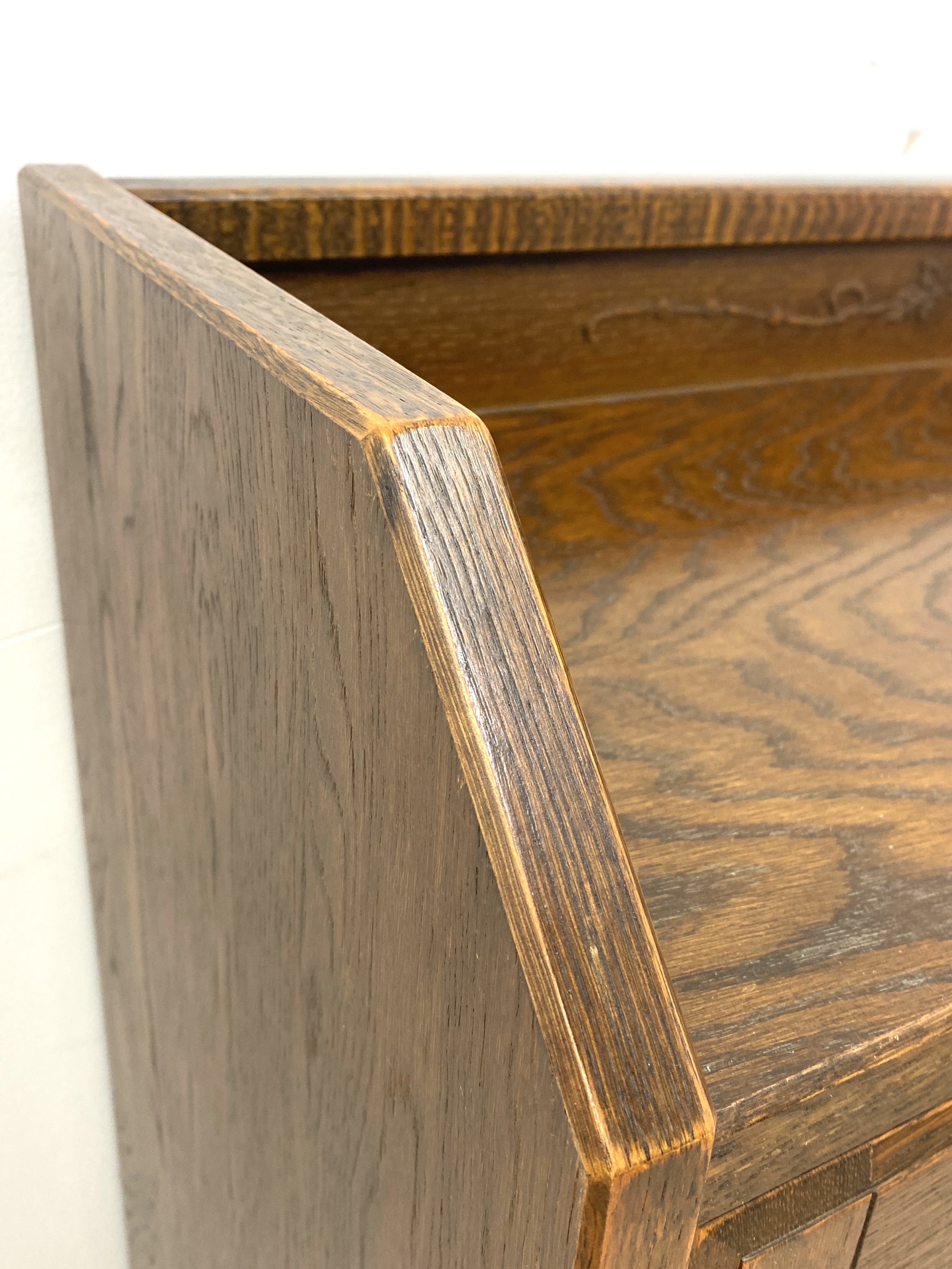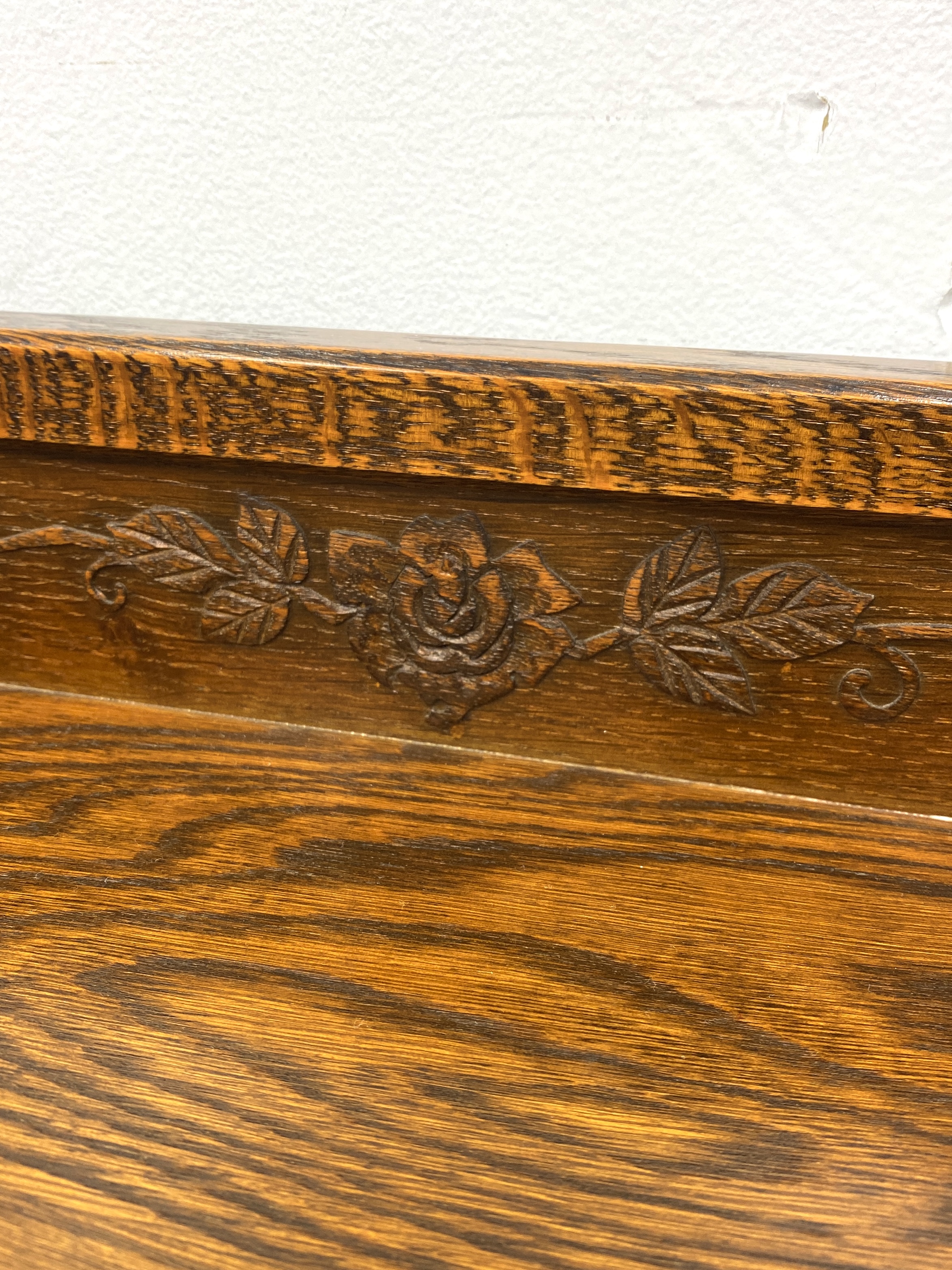 こちらは三越家具 Bruggeのサイドボードです。 中古品です。 【三越家具】 明治43年に創設された三越百貨店の家具加工部、三越環境デザイン(現・㈱三越伊勢丹プロパティデザイン)です。 創業以来、60年以上にわたり最高水準の特注家具や造作家具、 オリジナル家具シリーズBrugge(ブルージュ)を手掛けている高級家具メーカーです。 ブルージュは、現在「カントリーハウス」と改名していますが変わらず根強い人気を誇っています。 三越家具による「Brugge ブルージュ」シリーズ よりサイドボードです。 Bruggeは英国カントリースタイルをベースに、ヨーロッパ各地のカントリーテイストを 日本の住環境に合わせてデザインした機能的でコンパクトなシリーズです。 ご紹介するサイドボードは虎斑杢目のオーク材を使った落ち着いた雰囲気のお品で、 職人の手によるアンティーク調の塗装やステンドグラスなどの装飾など、仕上げにもこだわった逸品です。 ガラス扉には薔薇の花が彫刻され、カットしたガラスを一枚一枚組み合わせる伝統的な工法で仕上げられています。 トップには木工職人による美しいレリーフが彫り込まれ、優雅で高級感が漂います。 古き良き西欧の伝統を感じさせるクラシカルなデザインで、程よく古びた風合いが素朴で優しい雰囲気を演出してくれます。 コンパクトながら収納力もあり、キッチンからリビング、寝室まで場所を選ばすお使いいただけます。 【コンディションについて】 全体に薄いキズなどありますが、程よく使い込まれた良い風合いとなっています。 棚板には一部ペン跡があります。木の温かみや経年変化を楽しみながら、長くお使いいただける家具です。 他詳細については下記画像も併せてご参照ください。