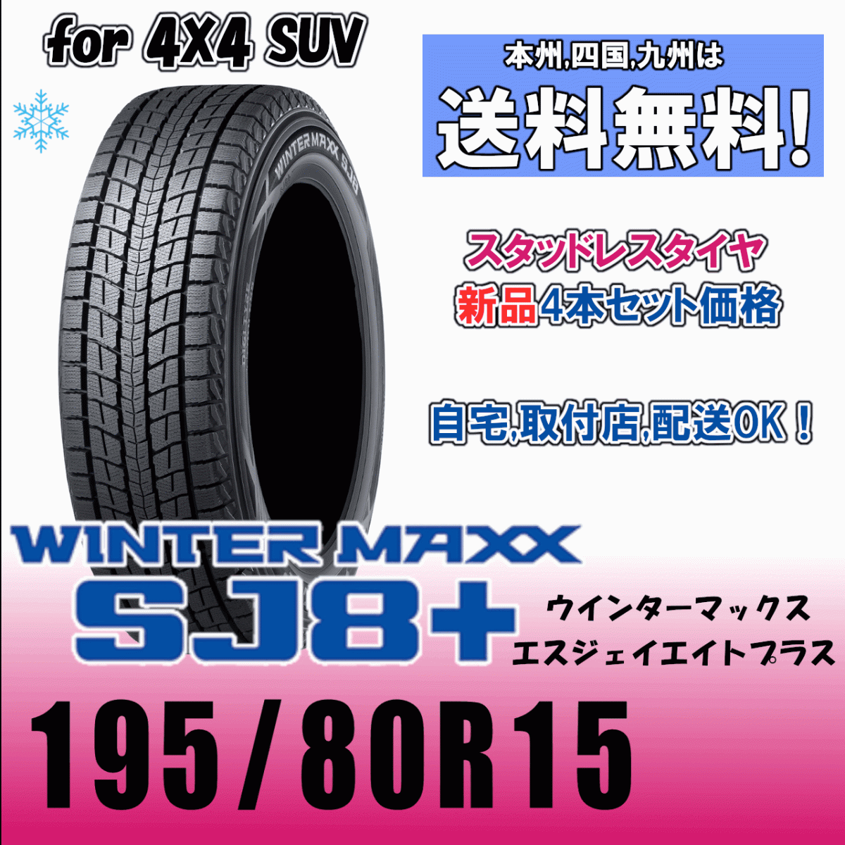 タイヤ :ダンロップ ウインターマックス SJ8+ サイズ :195/80R15 96Q 状態 :新品、未使用品 本数 :4本 4本必要でしたら個数「1」で入札してください。 | ||