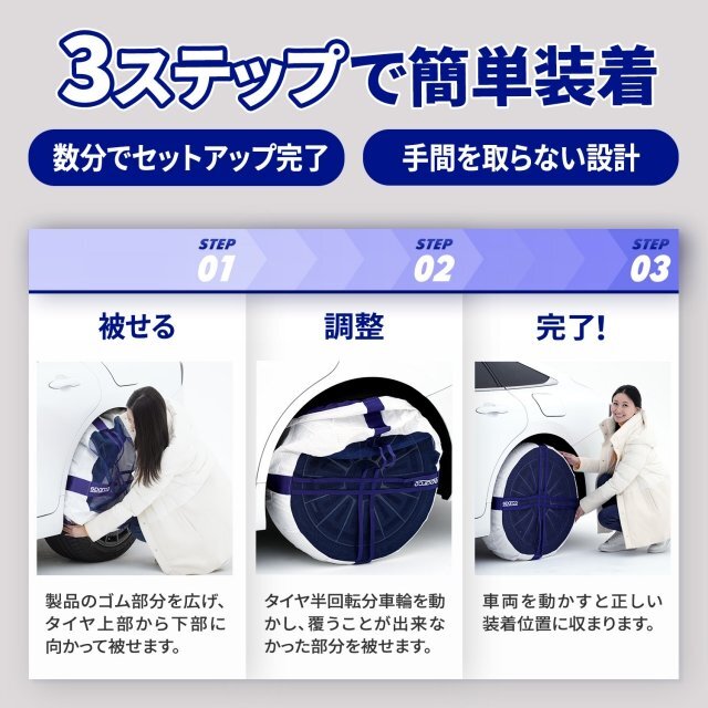 本製品は、どなたでも簡単に約3分ほどで装着が可能です。タイヤ上部に被せ、車両を前進または後進させ、タイヤを半回転させます。最後に残りを被せれば装着完了です。装着後は自動で正しい位置にセンターリングされます。布製なのでタイヤやホイールに傷がつかず、静音性に優れ、金属チェーンに比べ振動も少なく、快適な走行が可能です。超軽量設計でコンパクトに収納できるため、持ち運びや保管も簡単。クリアランスが狭いスポーツカーやスタッドレスがない大口径タイヤにも対応しています。