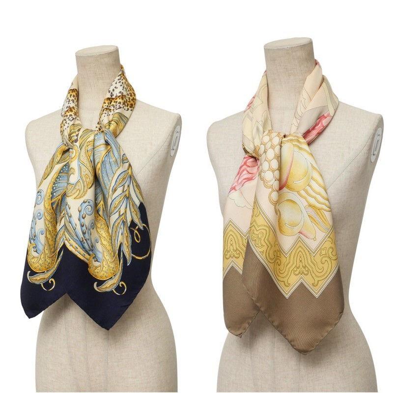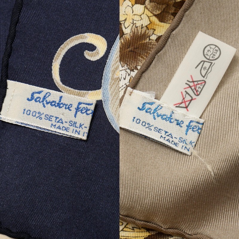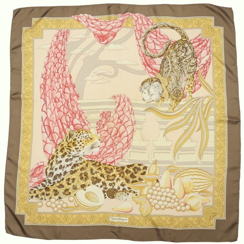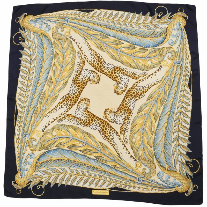 | MI3245*《ヴィンテージスカーフ 2点セット》サルヴァトーレフェラガモ レオパード アニマル柄 大判シルクスカーフ ストール イタリア製 | |||