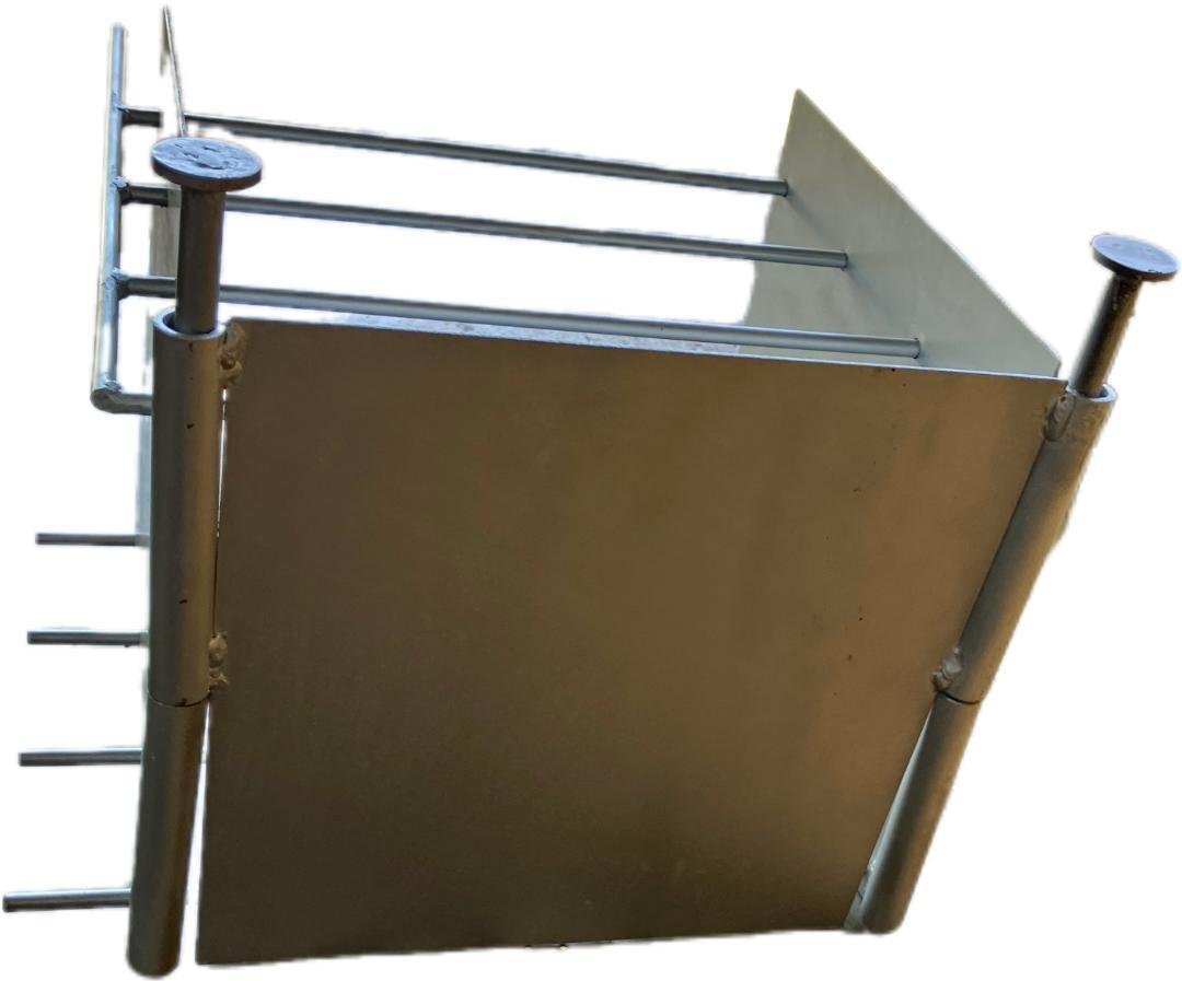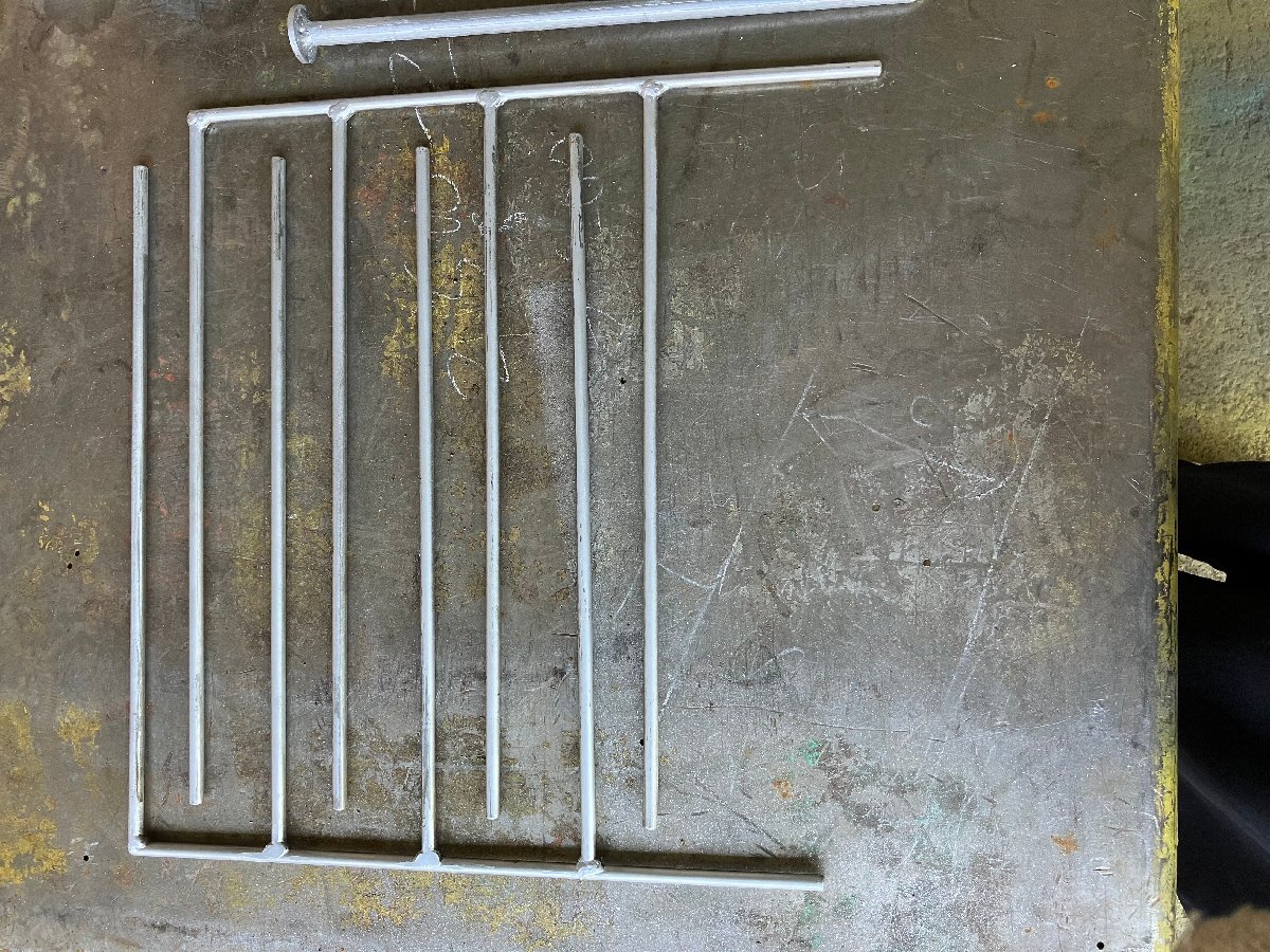折り畳み式のため、非常にコンパクトに収納できます。 一番奥の縦棒は、地面に打てるように工夫されております。 (