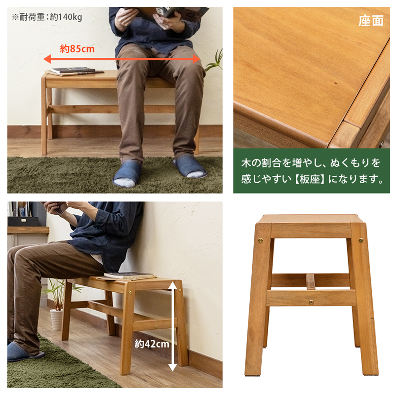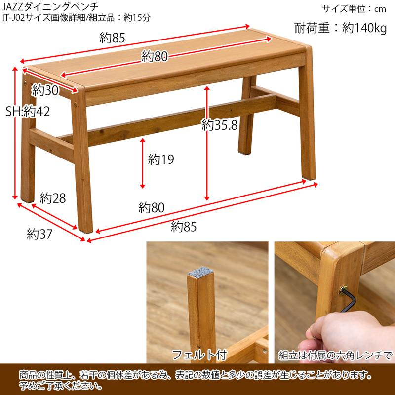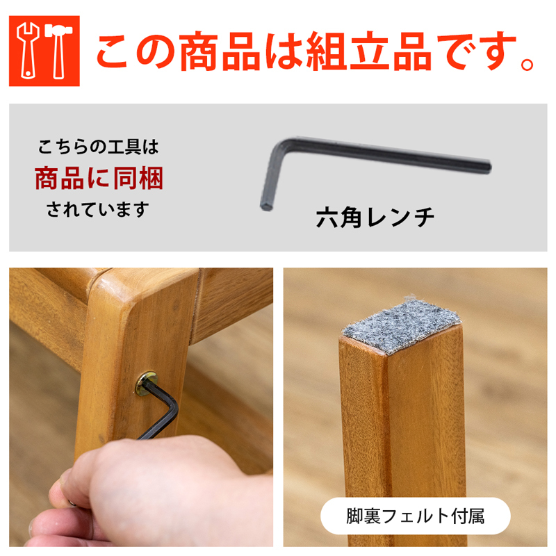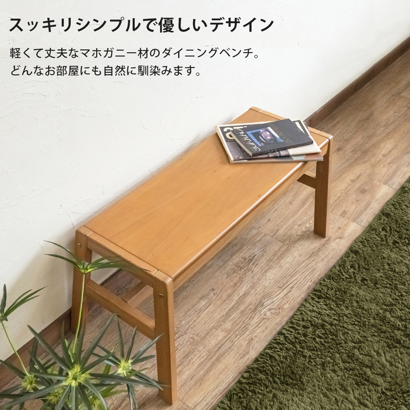 | 商品説明 | 組立品(15分) 工具付属 お部屋を優しいイメージに仕上げてくれるマホガニー材のダイニングベンチ。 どこにでも置けて、お手頃価格で買い替えや買い足しにもおすすめです。 シンプルでスッキリした細身のデザインのダイニングベンチ(1~2人掛け)。 マホガニー材を使用したことでお部屋に穏やかなぬくもりをプラスしてくれます。 ダイニングに限らず玄関先やお部屋の隅など様々な場所で気軽にお使いいただけます。 ※脚部にはフェルト付。座面にはクッションが付属しません。 |