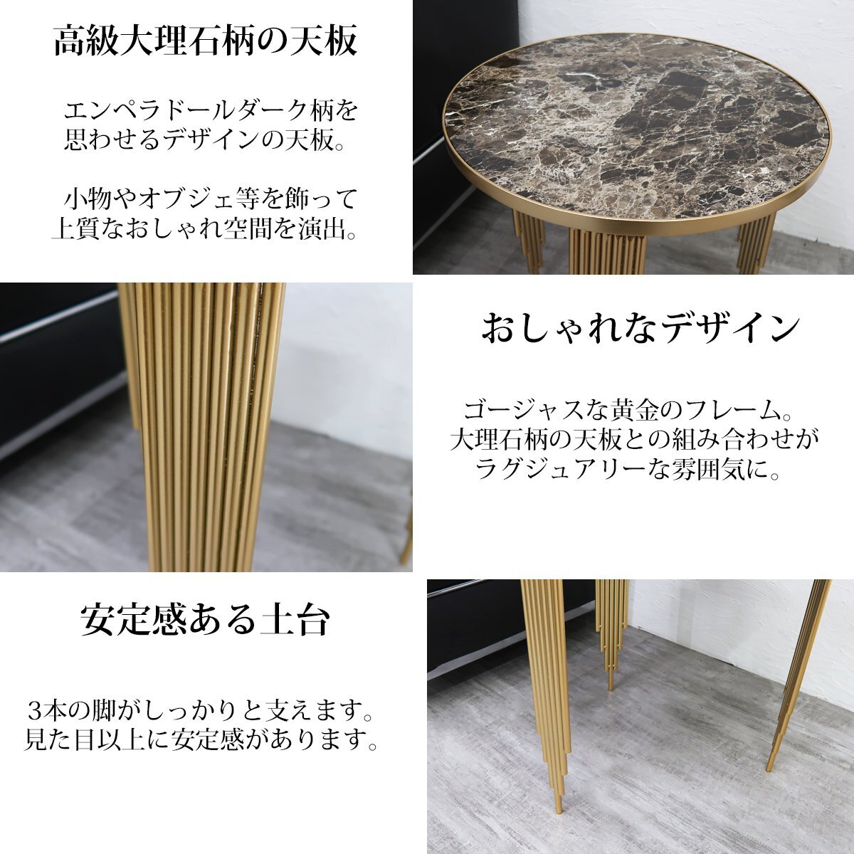 ![]() ※画像一枚目の商品になります。 最上級の空間を。 海外ホテルの様な空間を演出する大理石柄天板のサイドテーブル。 重厚感と高級感を存分に放ち、大理石柄を贅沢にあしらったテーブルはラグジュアリーな空間作りに最適です。 天板表面は綺麗に加工されており耐久性があります。 撥水性、キズに強く、拭き取り簡単でお手入れラクラク 。 黄金のフレームとエンペラドールダーク柄を思わせる大理石柄天板の組み合わせが 他にはない特別な空間を彩ります。 ソファ横、ベッドサイド、リビング等に置いてワンランク上のおしゃれな小物置きに。 高級感あふれるデザインが視覚的な楽しみも与えてくれるオブジェとしても楽しめます。 商品仕様 サイズ(約):天板直径40cm、高さ43cm 重量(約):2.9kg 材質:フレーム:鉄 天板:天然木化粧繊維板(ウォルナット) |