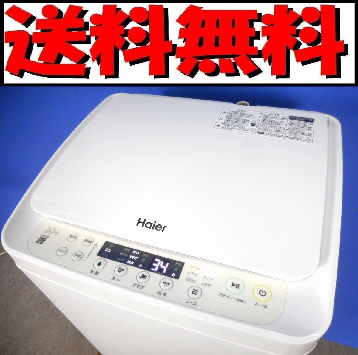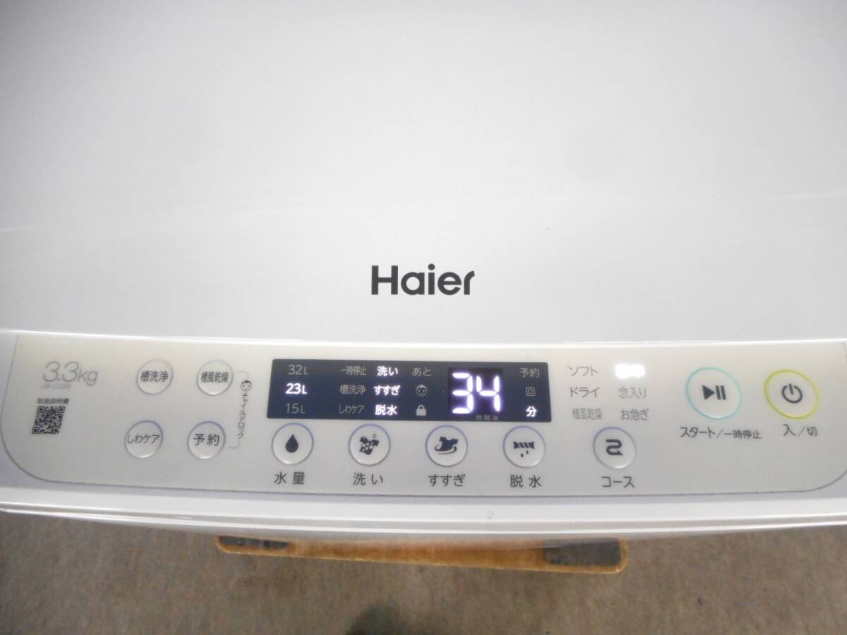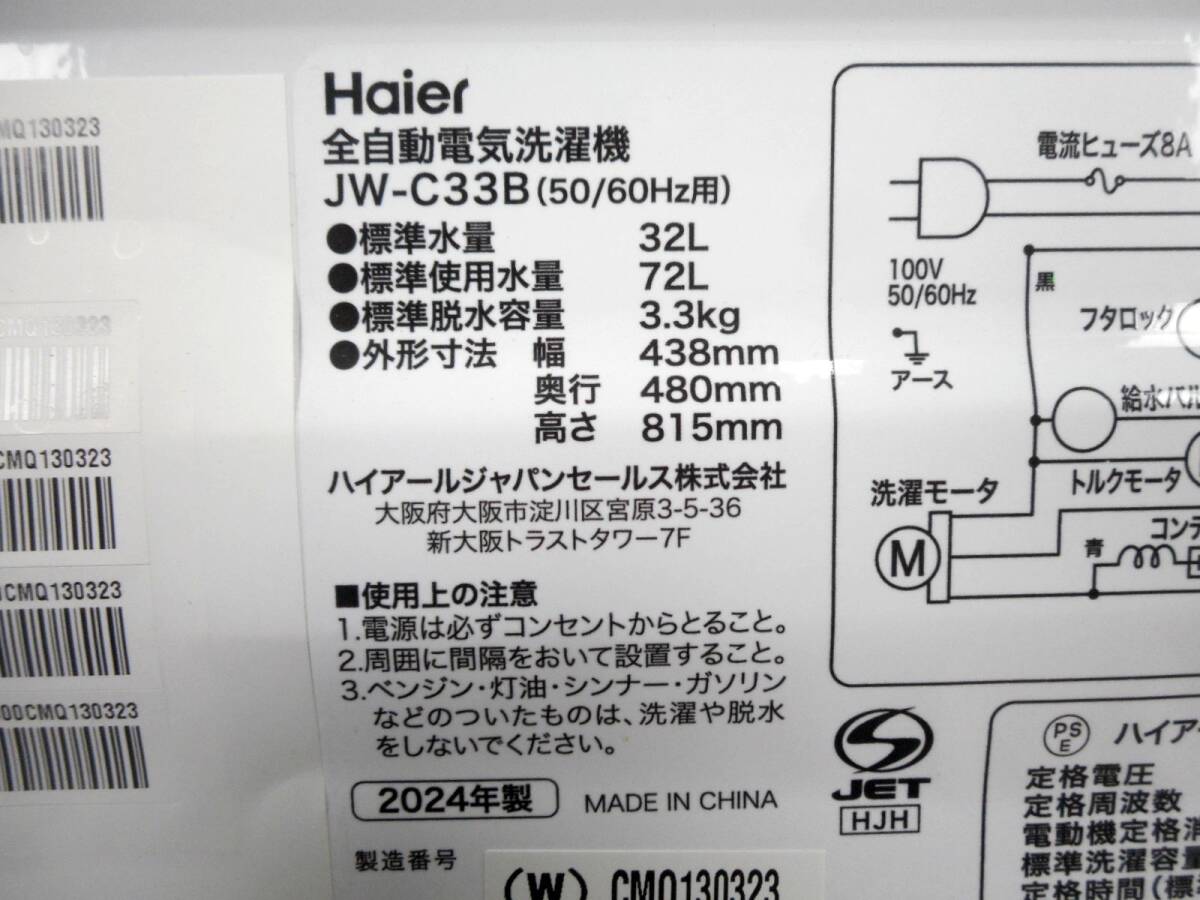 こちらの商品は、本州のみ「送料無料」にて発送致します。 ドライバーさん1人による玄関先卸しとなります。 ※状況により、荷下ろし時にお手伝いが必要な場合がございます。 ※北海道・四国・九州・沖縄・離島は、 ヤマト家財便元払い「落札者様負担」Cランクでの発送です。 Haier ハイアール 3.3kg全自動洗濯機 JW-C33B-W 2024年製 洗濯・脱水容量:3.3kg 外形寸法:(約)W438×D480×H815mm 質量:(約)21.0kg 付属品:本体・給水ホース・排水ホース・排水つぎ手・取扱説明書 ※蛇口用アタッチメントは、付属しておりません。 動作確認・除菌クリーニング済みです。 外装に、目立つ汚れ・欠損箇所はございません。 内装に割れ・欠け等のないきれいな状態だと思います。 向かって左側下部に傷がございます(画像8枚目参照) USED品ですので、使用感・スレ・小傷等は、ございます。 商品状態は、画像にてご判断ください。 画像は撮影時及びPC環境設定により、異なる場合がございます。予めご了承ください。 画像を多数掲載しておりますので、PCにてご確認・ご参照くださいますようお願い致します。 携帯電話・スマートフォンでは、ご覧いただけない場合がございます。