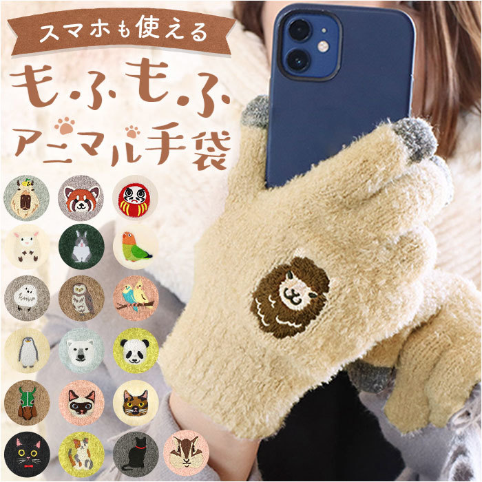 | 商品説明 | ・・スマホも使える!動物の刺繍がかわいい♪もふもふスマホ手袋。 ・親指、人差し指、中指にスマホ対応加工が施されていて、着けたままスマホなどのタッチパネルの操作が可能。 ・寒い冬、通勤や通学時など色々なシーンで手袋を外さずに使えるのが嬉しい♪ ・もふもふっとした、とっても気持ち良い肌触り。 ・ほどよいフィット感で脱げにくいのもうれしいポイント。 ・ほっこり優しいアニマル刺繍がアクセント★ ・豊富なカラバリからお気に入りの子を見つけて♪ |