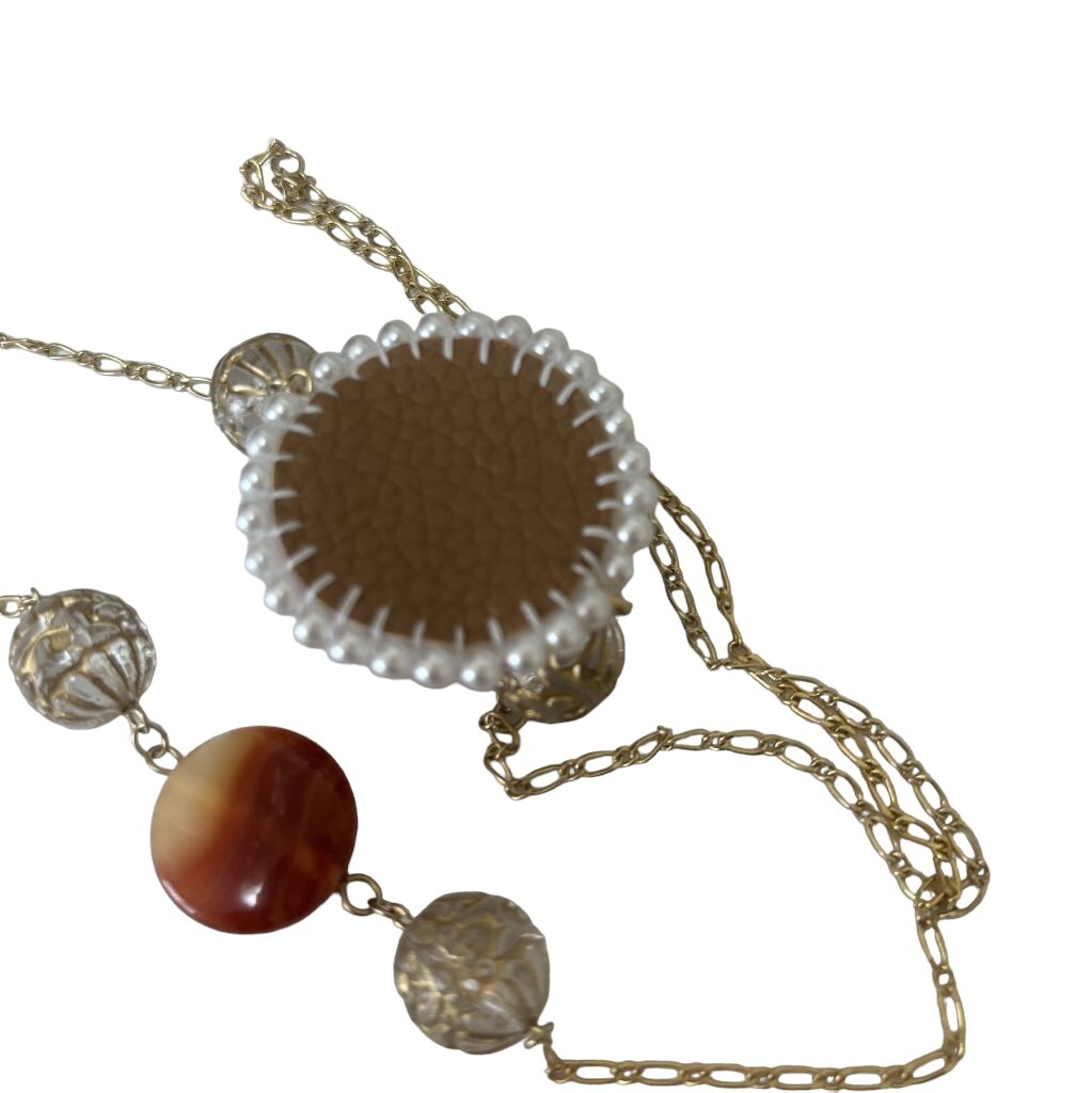 ペットボトルキャップをリサイクルして作られた帽子チャームがついためがねチェーンです。