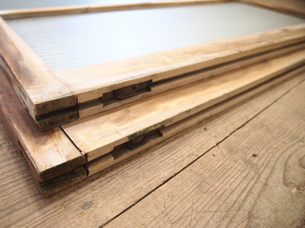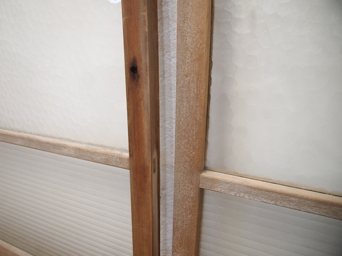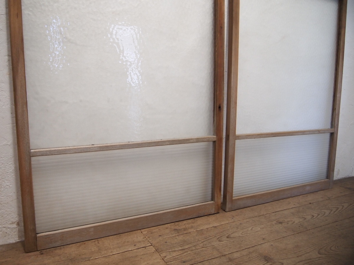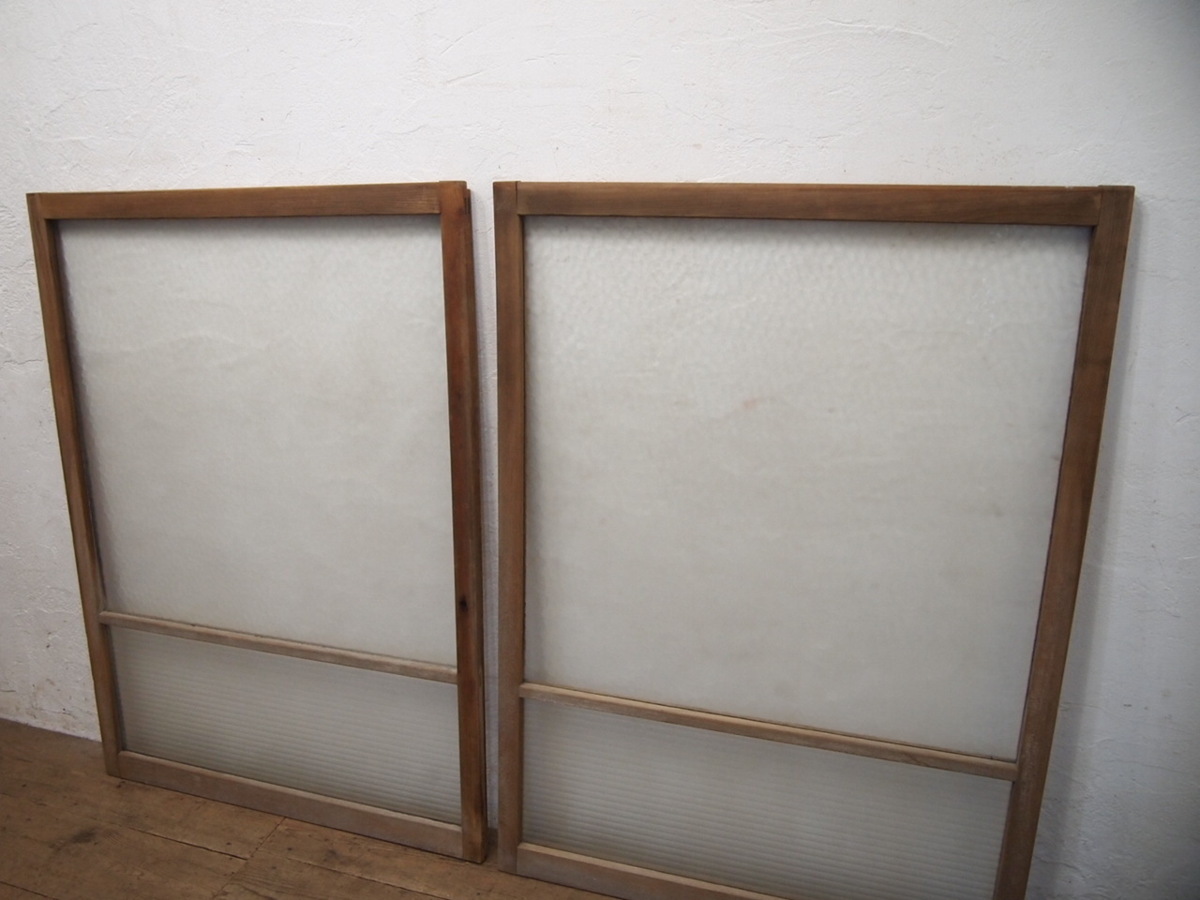 商品情報 | ■商品詳細■ レトロな古い木枠ガラス戸、2枚セットです。 長年使い込まれた味わいのある品です。 ガラスは、デザインガラスと銀モールガラスを使用しています。 一般のご家庭はもちろん、レトロな店舗什器にもお勧めです。 経年の傷や欠け、染み等がありますが、使用には問題ありません。 ガラスにひびや割れはありません。 古い物とご理解いただければ幸いです。 ご不明な点などありましたら、質問欄にてお願いします。 ■サイズ■ 全体(最大値) (H 125,5cm×W 90cm×D 3cm)×2枚 竪框 4cm 多少の誤差はご了承下さい。 |