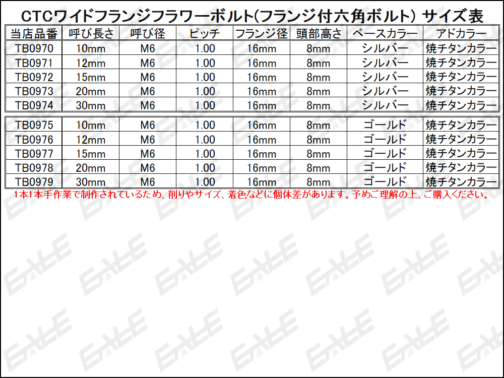 M6 CTCワイドフランジフラワーボルト (フランジ付六角ボルト) 丁寧に削り出されたボルトは、金メッキを施した上に特殊な方法で焼チタンカラーを再現した美しい仕上がりで、特にヘッド部分は穴あけ加工され、ボルトトップ内が花のような模様になった普通のボルトにはない仕上がりです。 またワイドになったフランジ部分には、等間隔に6つの孔を削り込んだ多孔タイプになっています。 ステンレスを使用しているので強度も十分にあり、広い座面で密着度を上げ、しっかりと固定したい場所に使用して頂けるよう各種サイズを用意しました。 また穴あけ加工されたヘッドはワイヤーロックが可能です。 ※出品は右記およびタイトルの“呼び長さ”“カラー”です。 ご落札後の変更はお受けできませんので必ずご確認下さい。 他の呼び長さは⇒ こちら 同デザインで違う呼び径・呼び長さ・カラーは⇒ こちら その他の六角ボルト・キャップボルトは⇒ こちら その他のボタンボルトは⇒ こちら その他のネジ(ビス・スクリュー)は⇒ こちら その他のナット・ワッシャーは⇒ こちら |
