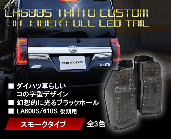 ▼ 出品内容 商品番号:J162SM 車種:LA600/610タントカスタム 後期 商品名:LEDテール カラー:スモーク ※ご注文後のカラー変更はご対応致しかねますので ご入札前に必ずカラーをご確認下さい。 他のカラーの出品ページは 【 こちら 】 ▼ 商品説明 新発売クリスタルアイ LA600Sタントカスタム 3DファイバーフルLEDテールランプ 新品左右セット ポジションランプONで、 ダイハツ車らしくコの字型に 左右合計34発LEDと ブラックホールが幻想的に点灯します。 ブレーキランプは、コの字型部のLEDが リフレクターに反射し大粒に点灯します。 バックは、内側の縦に並んだ左右合計18発の LEDが点灯。 ウインカーは、ブラックホール周囲の ファイバー内74発のLEDが点灯する 粒々LEDならでは 明るい点灯感を実現したLEDテールです。 ▼ 対応車種 LA600S/610S タントカスタム (2015年4月以降の車両に限ります。) ※2013年4月~2015年4月までの車両は、 こちらの商品は適合いたしませんので 前期用お買い求めください。 ※タントにも取り付け可能 (ライトの形状がカスタムと異なる為、 側面などがやや内側に入り込みます。 |
