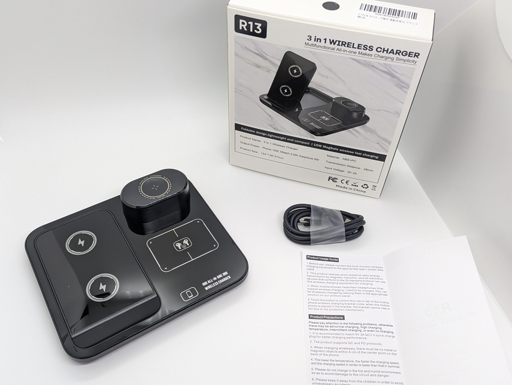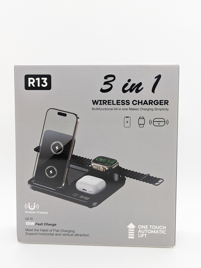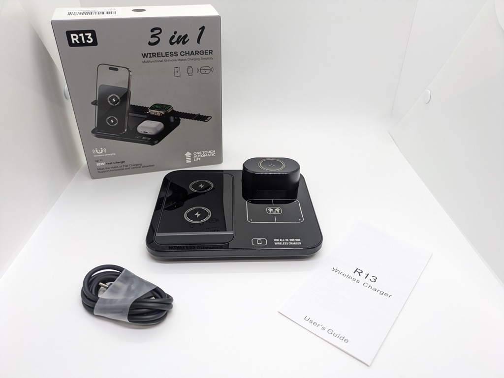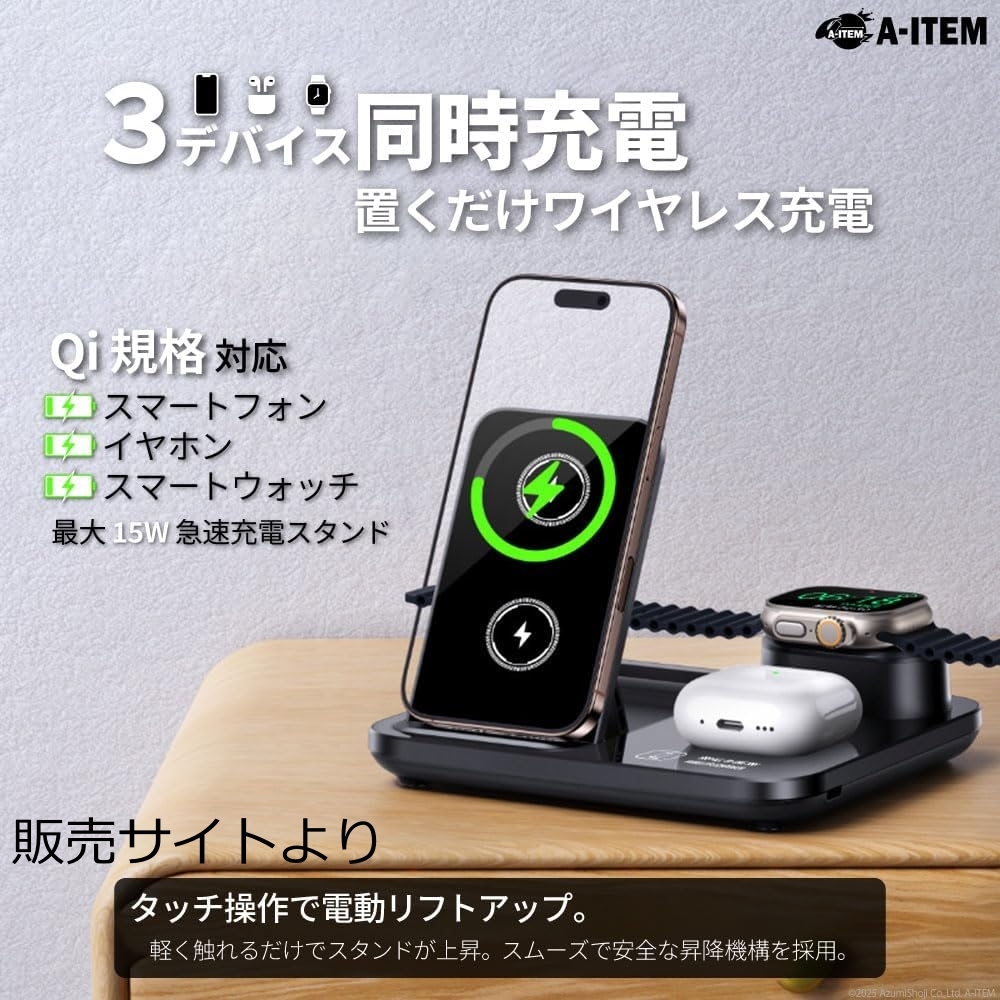 | ワイヤレス充電スタンド 3in1 Qi対応 15W 急速 同時 ブラック R13 自動昇降式 | |