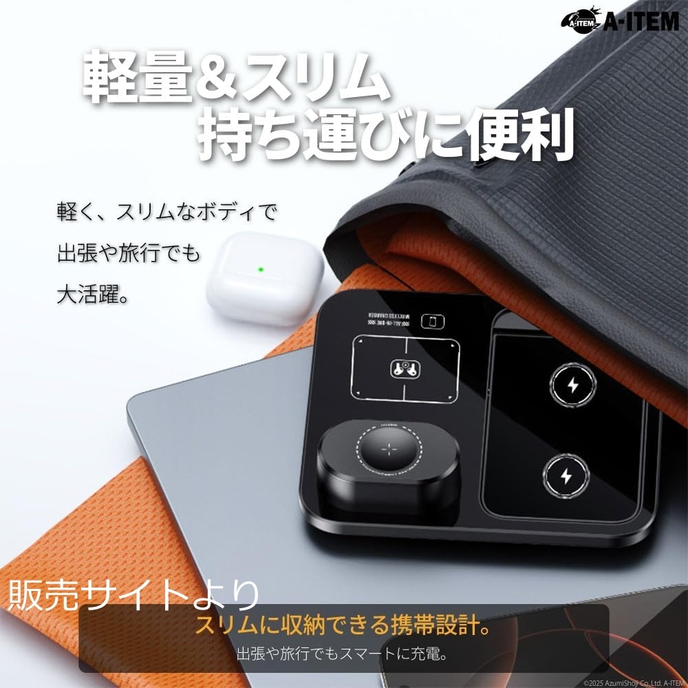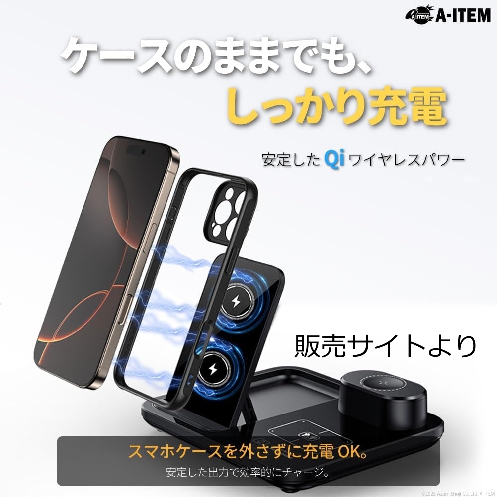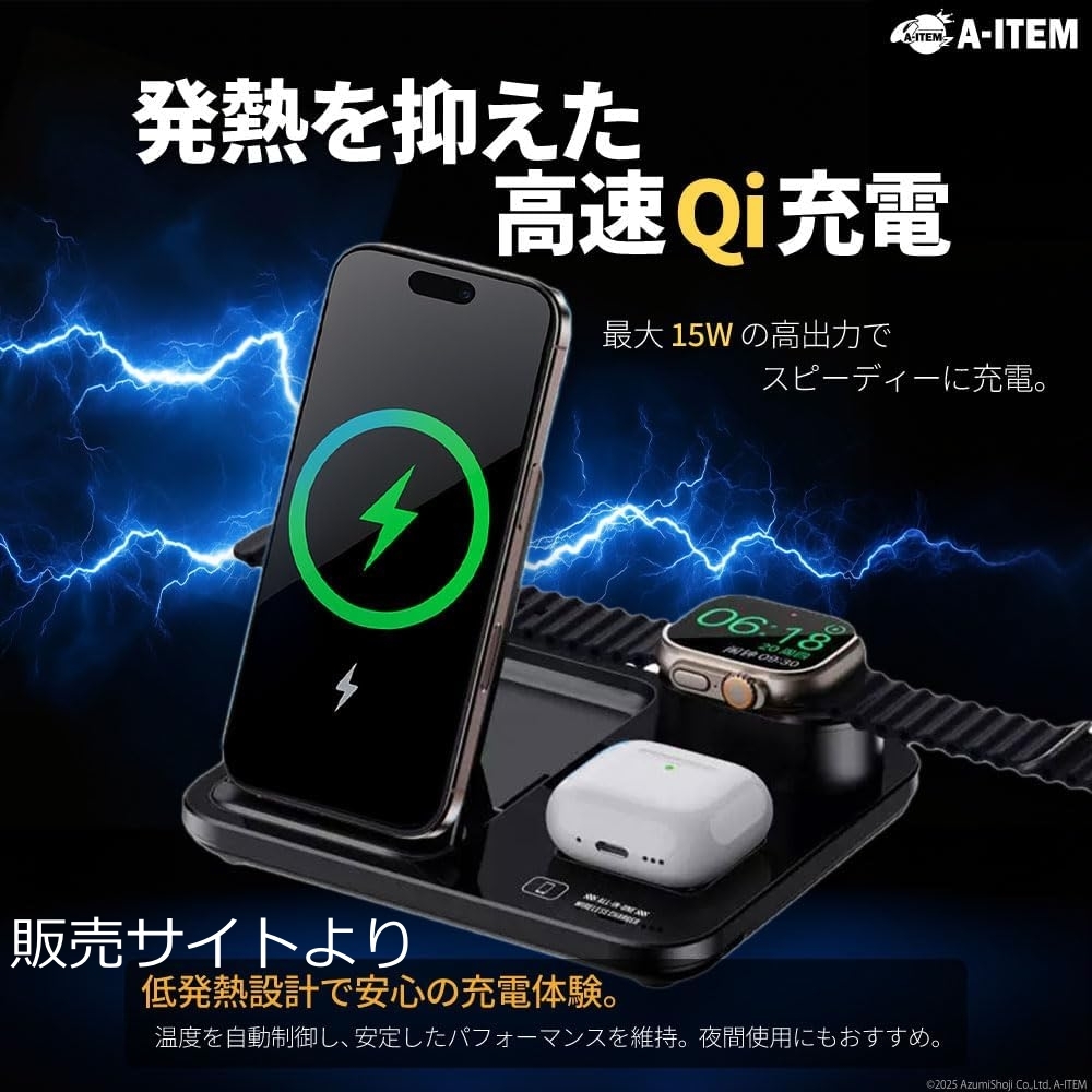 | 商品説明 | ワイヤレス充電スタンド 3in1 Qi対応 15W 急速 同時 ブラック R13 自動昇降式 最大15Wの高速Qi充電に対応した3デバイス同時充電器。未使用。 A-ITEM - モデル: R13 3 in 1 ワイヤレス充電器 - 対応規格: Qi規格 - 同時充電デバイス数: 3デバイス - 最大出力: 15W - 機能: 発熱抑制設計 - 付属品: ユーザーガイド、充電ケーブル 販売サイトより、 ───────────────────── 【3台同時ワイヤレス充電】 スマートフォン・ワイヤレスイヤホン・スマートウォッチを同時に充電できるQi対応3in1充電ステーション。ケーブルを減らしてデスクまわりをすっきり整理。 【タッチ操作の電動昇降スタンド】 前面のタッチボタンを押すとスタンドが自動で上昇。デバイスをセットしやすく、スマートな操作感を実現。 【最大15Wの急速充電対応】 Qi規格対応デバイスに最大15Wで出力。置くだけで充電が始まり、シンプルで効率的なワイヤレス充電をサポート。 【安心の多重保護機能】 過電流・過電圧・過熱・異物検出などの安全設計で、安定した充電を実現。夜間や長時間使用にも安心。 【スタイリッシュな固定デザイン】 艶のあるブラックボディが空間になじむ高級感。軽量でコンパクト、出張や旅行の持ち運びにも便利。 ───────────────────── ご覧いただきありがとうございます。 個人保管の未使用品です。神経質な方はご遠慮ください。即発送できます。 ワット数...11?20W |