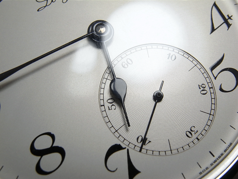 6時位置のスモールセコンドにはレコード状の溝とミニッツレールが刻まれており、