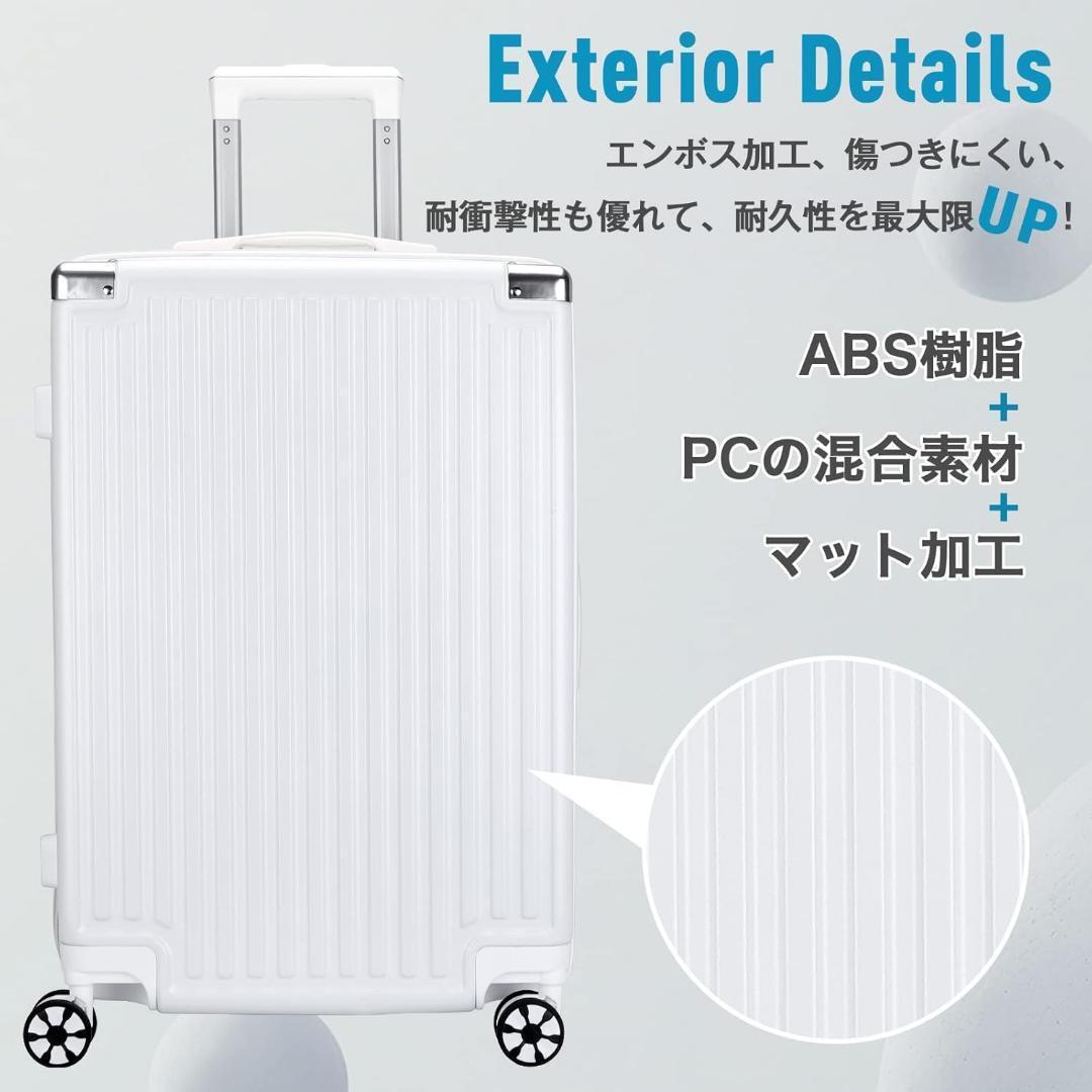 ABS樹脂とPCの混合素材で作られたこのキャリーケースは、純ABS樹脂より耐衝撃性が優れています。エンボス加工により、キャリーケースのボディが傷つきにくくなり、マット加工も加えて、ぶつかると傷ついでも、目立たないです。キャリーバッグ自体の耐久性を保証しながら、ファッションな外観も兼ね備えています。