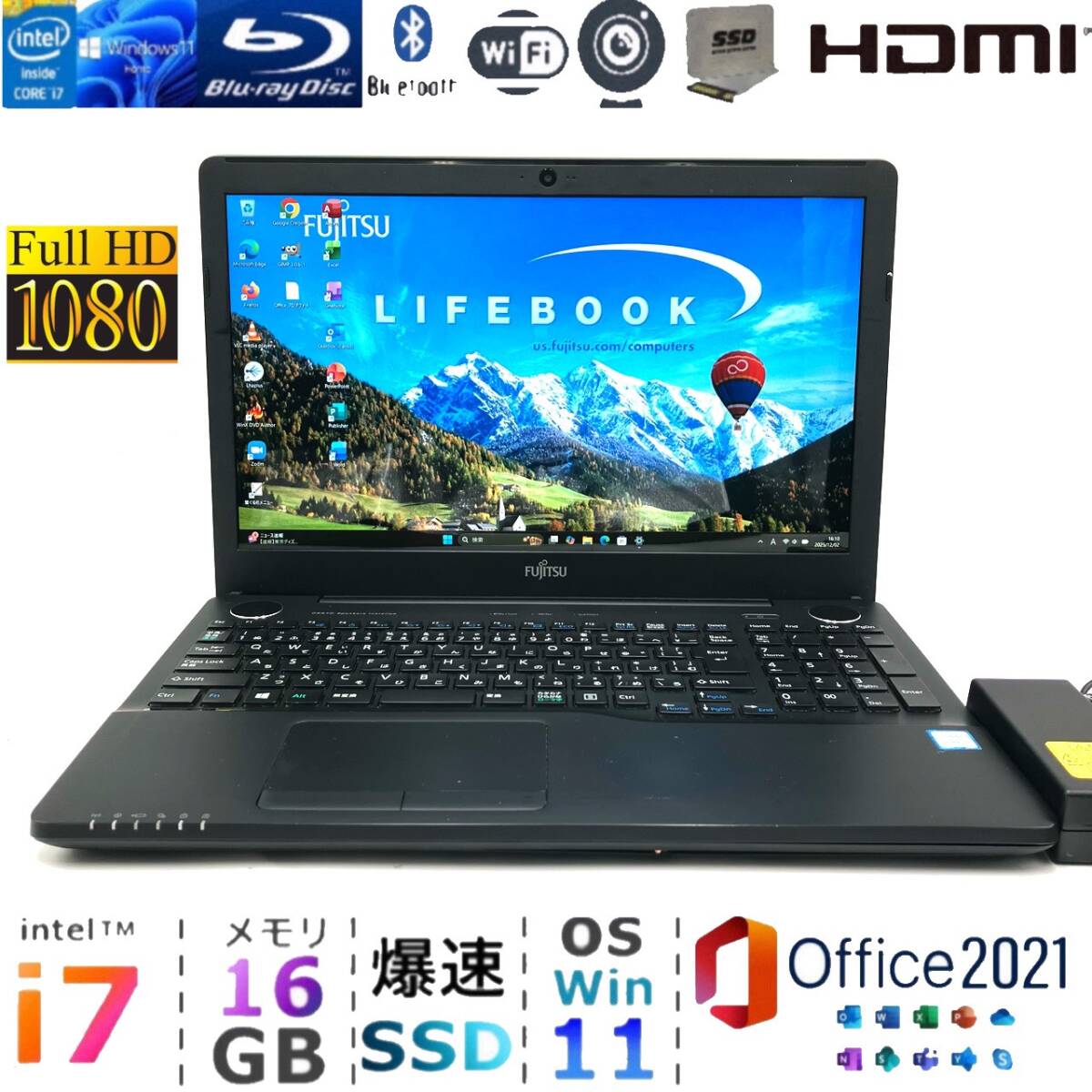 | 【配送商品の中身】 □ノートパソコン本体 (新品SSD、メモリ内蔵済み) □ACアダプタ □延長保証パンフレット 【スペック】 ■メーカー・型番:富士通 AH53/X ブラック ■インストールOS:最新版Windows11Home64ビット ■CPU:Core i7-6700HQ(4コア/8スレッド) ■メモリ:DDR416GB(8GBx2) ■容量:爆速新品SSD256GB ■光学ドライブ:ブルーレイドライブ(BD-RE) ■Office ・Microsoft Office 2021 Professional Plus(!から購入した正規品でプロダクトキー付属しています) ■装備 ●15.6型ワイドLEDバックライト付TFTカラーLCD(スーパーファイン液晶) 1920×1080ドット 1677万色 ●無線LAN対応 IEEE802.11a IEEE802.11b IEEE802.11g IEEE802.11n IEEE802.11ac ●有線LAN対応 ●USB3.0準拠×3(左側面×3(うち1ポートは電源オフUSB充電機能付))、USB2.0準拠×1(右側面×1) ● HDMIポート搭載 モニターに出力して大画面での作業や動画視聴も可能 ●Webカメラ搭載 ●Bluetooth v4.1搭載 ●マイク・ラインイン・ヘッドホン・ラインアウト・ヘッドセット兼用端子(φ3.5mmステレオ・ミニジャック) ■動作確認
